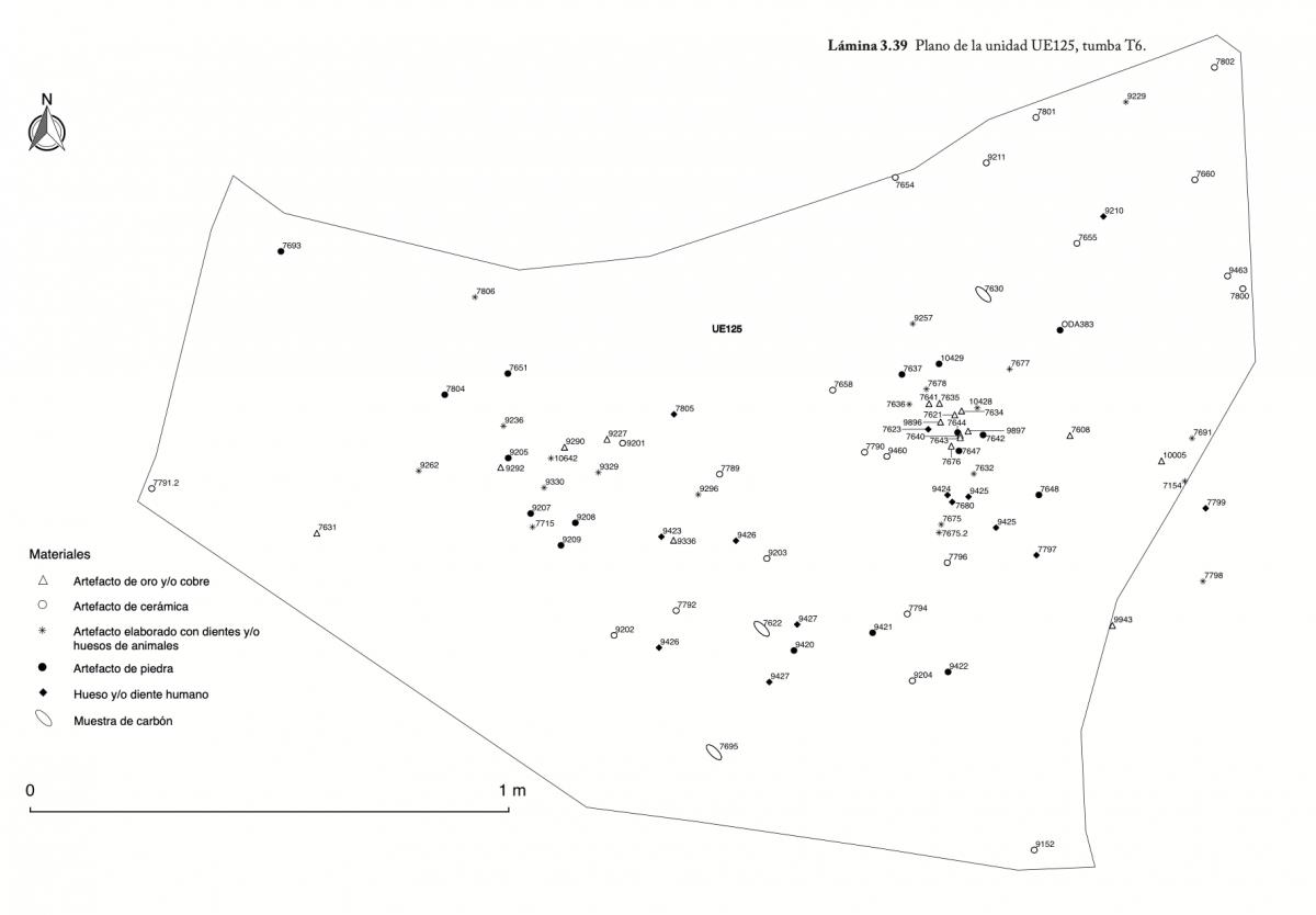 375 - T2-UE088. Depósito de artefactos y osamentas localizado a una profundidad de 2,20 m sobre la Plataforma II (piso más alto) de la tumba T2. Todos los cuerpos fueron colocados en decúbito v...