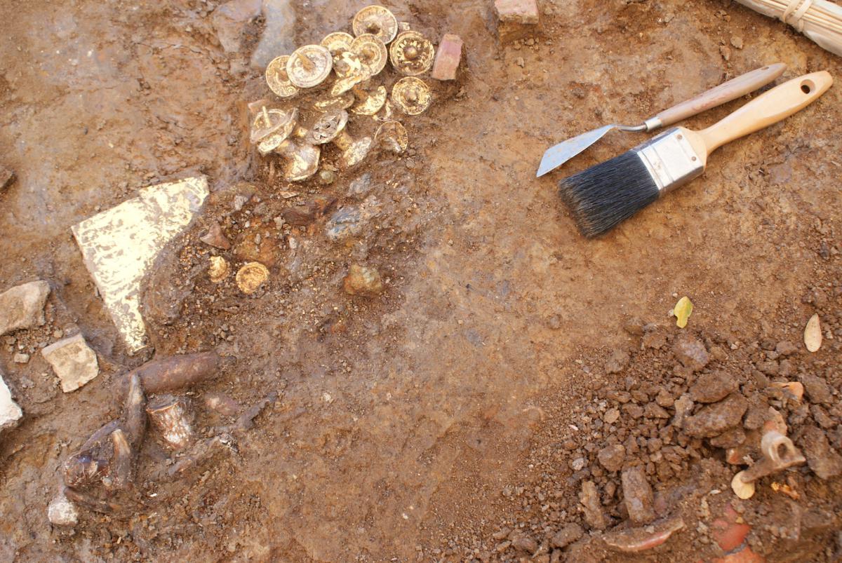 Vista superior de la UE125, se distinguen los restos de las osamentas que se encontraron tras retirar los platos y bandejas de cerámica que las cubrían.
