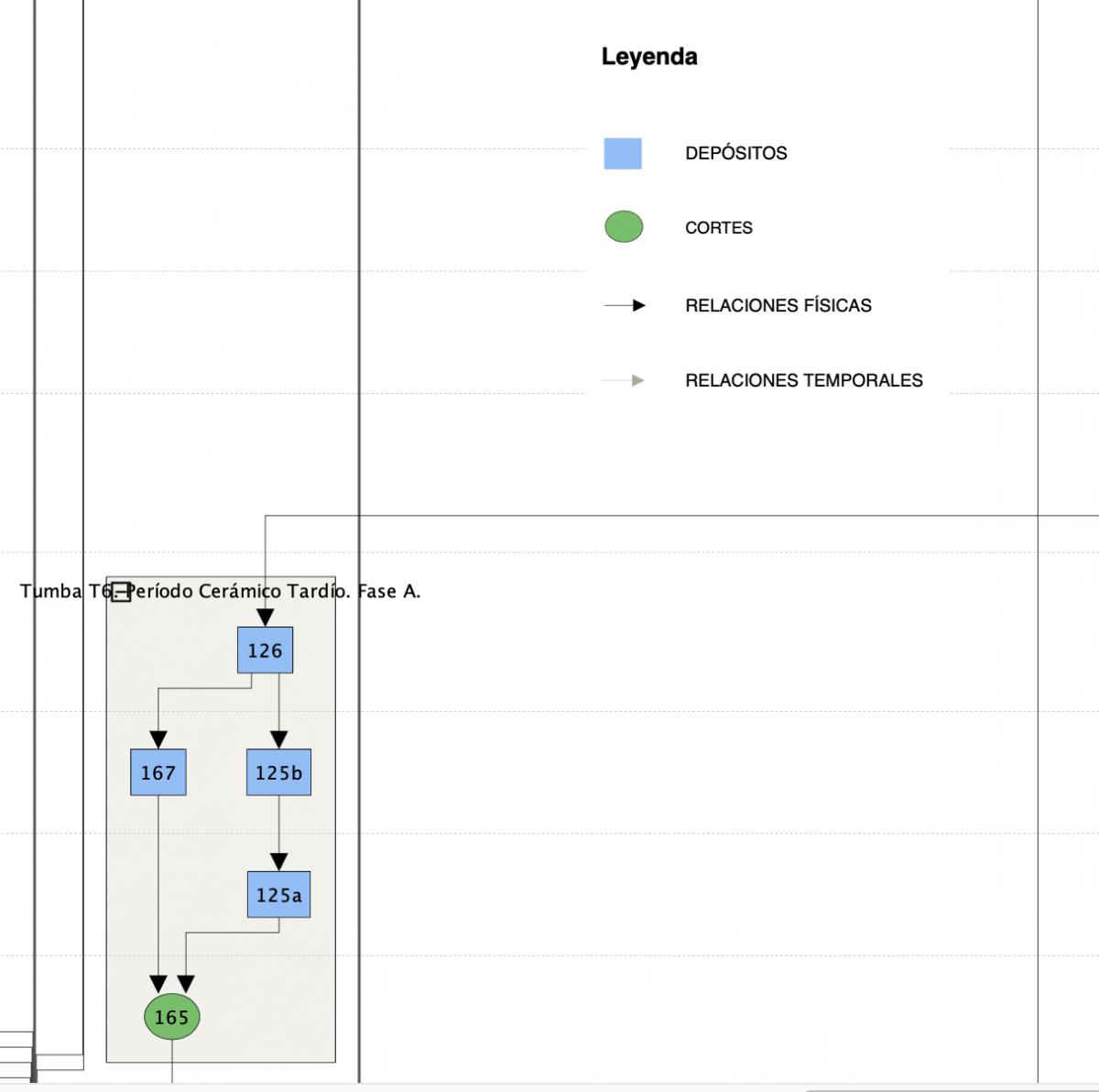 Las flechas de color gris claro y trazado discontinuo representan las relaciones cronológicas, - la sincronía se expresa con flechas de trazado horizontal, mientras que la relación entre unidades no contemporáneas se expresa con flechas de trazo vertical.
