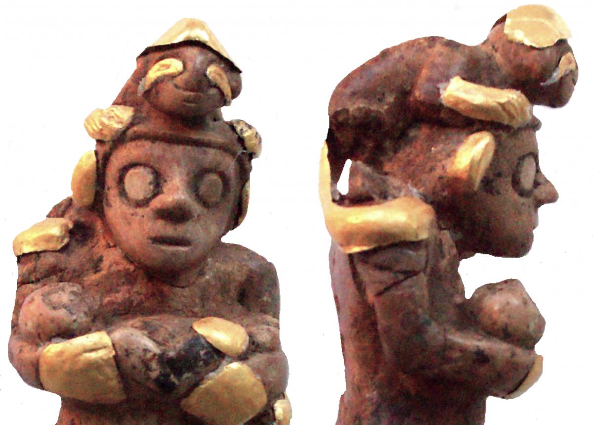 Detalles de una figura tallada en diente de cachalote con fundas de oro. 8.4x3.6x3 cm. Tumba T6. Estilo Conte. ID 954. Escenifica la ofrenda sacrificial de un infante por un oficiante ataviado ritualmente.