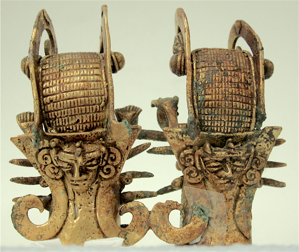 377 - Pendiente figurativo de oro fundido con la representación de un murciélago bicéfalo en vuelo que formaba parte del ajuar del individuo I5 de la tumba T2. EL aro de suspensión se localiza...