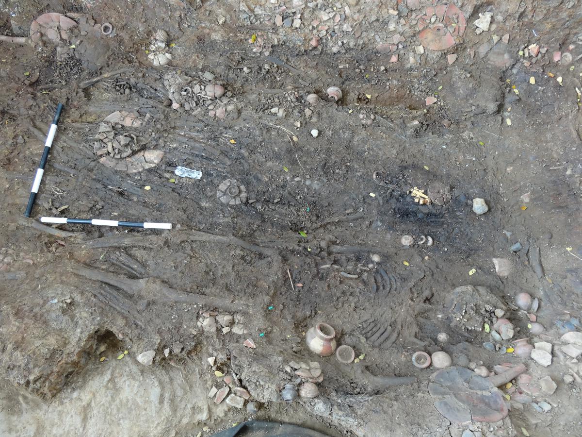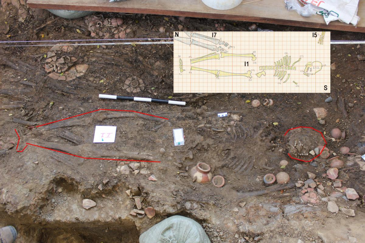 375 - T2-UE088. Depósito de artefactos y osamentas localizado a una profundidad de 2,20 m sobre la Plataforma II (piso más alto) de la tumba T2. Todos los cuerpos fueron colocados en decúbito v...