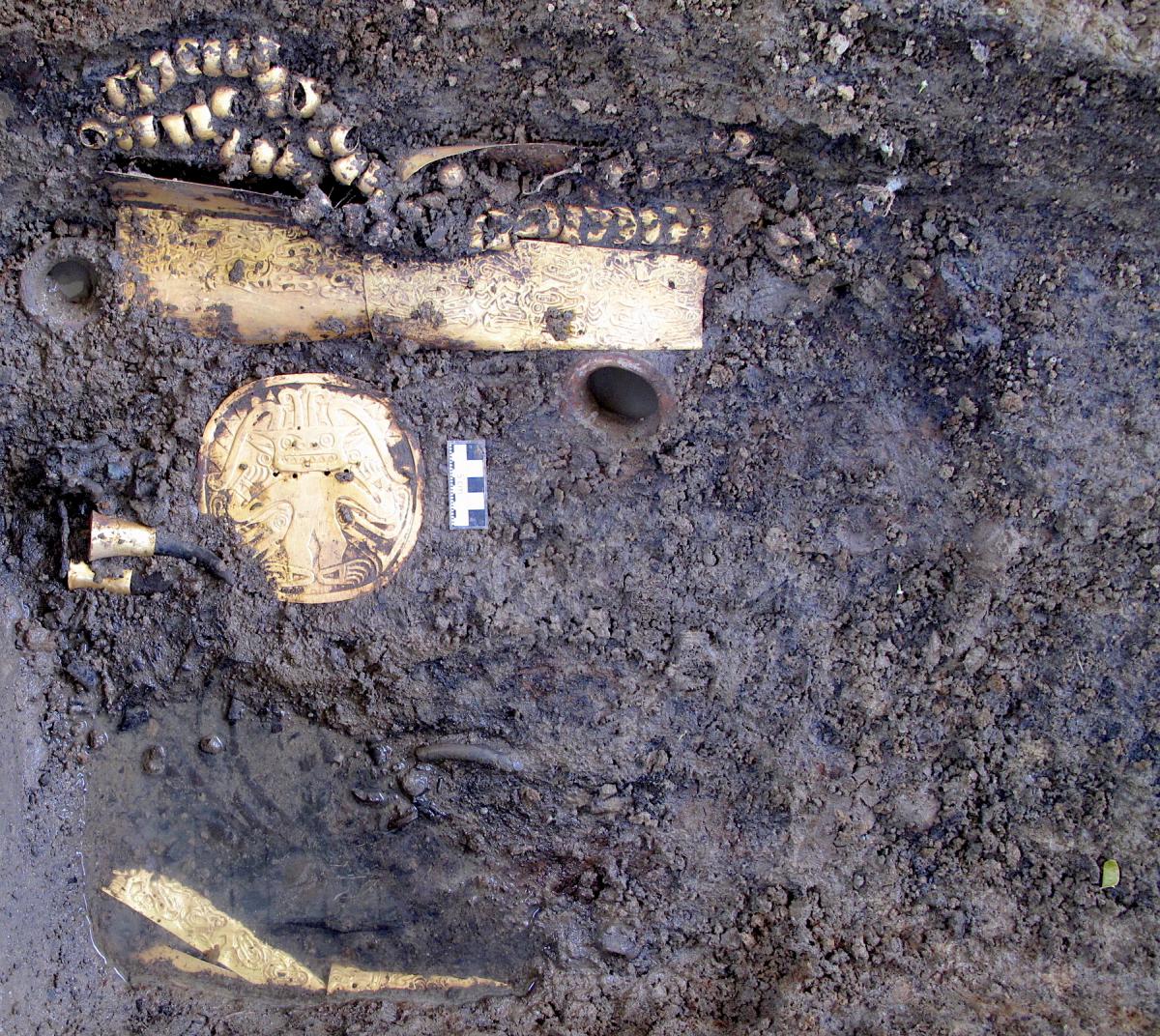 387 - Pectoral de oro martillado repujado con la representación frontal del rostro de un ser sobrenatural con rasgos de un anciano que formaba parte del ajuar del Individuo 20, un infante, de la ...