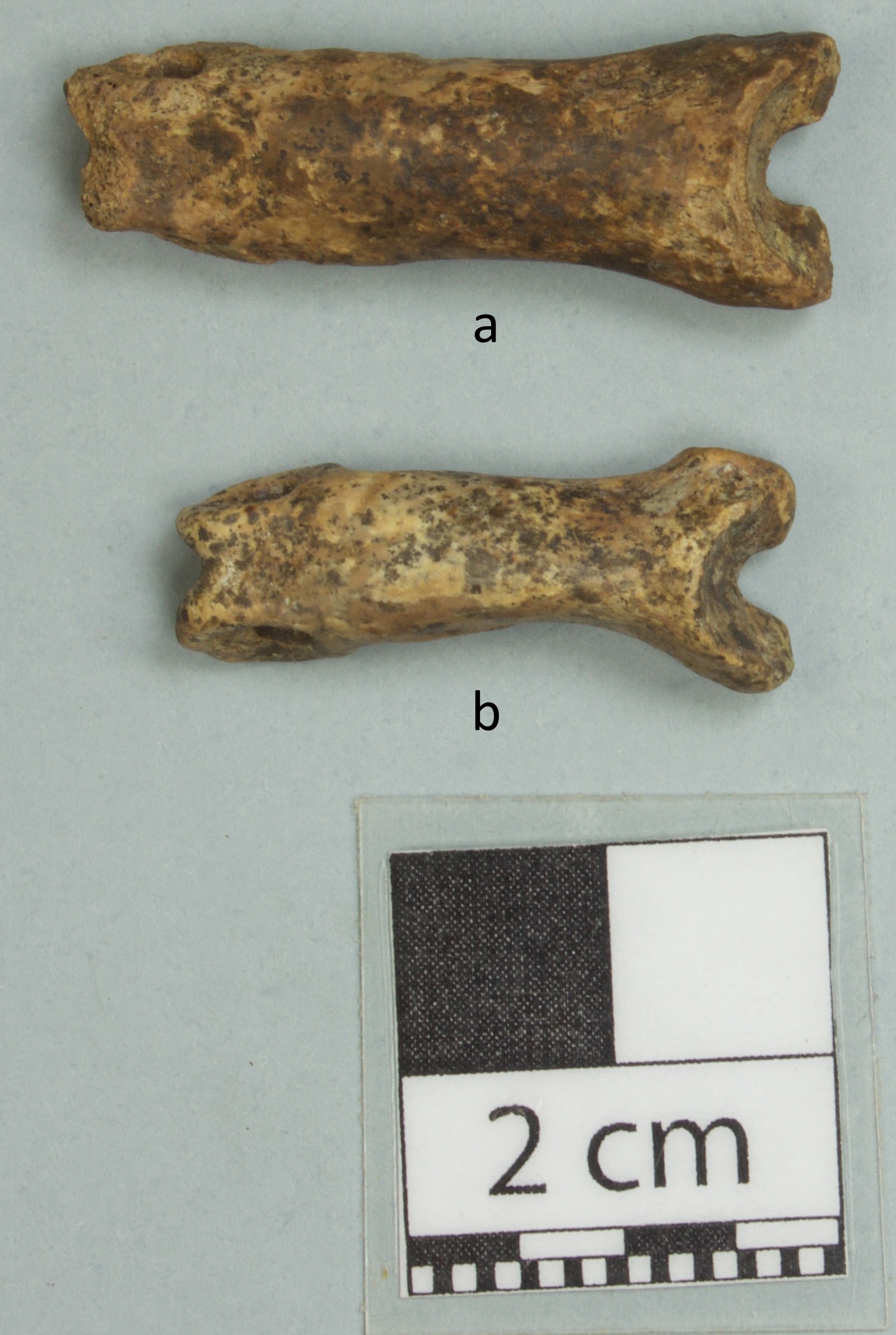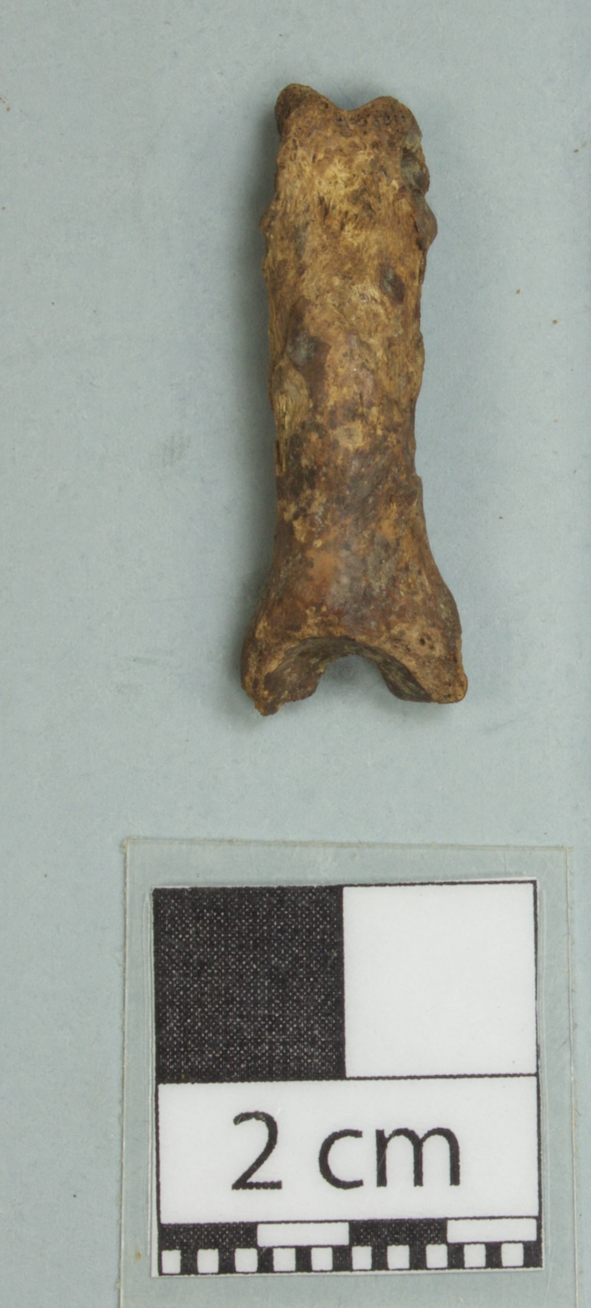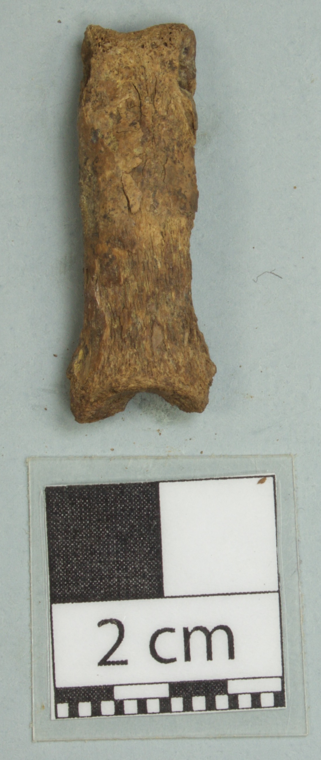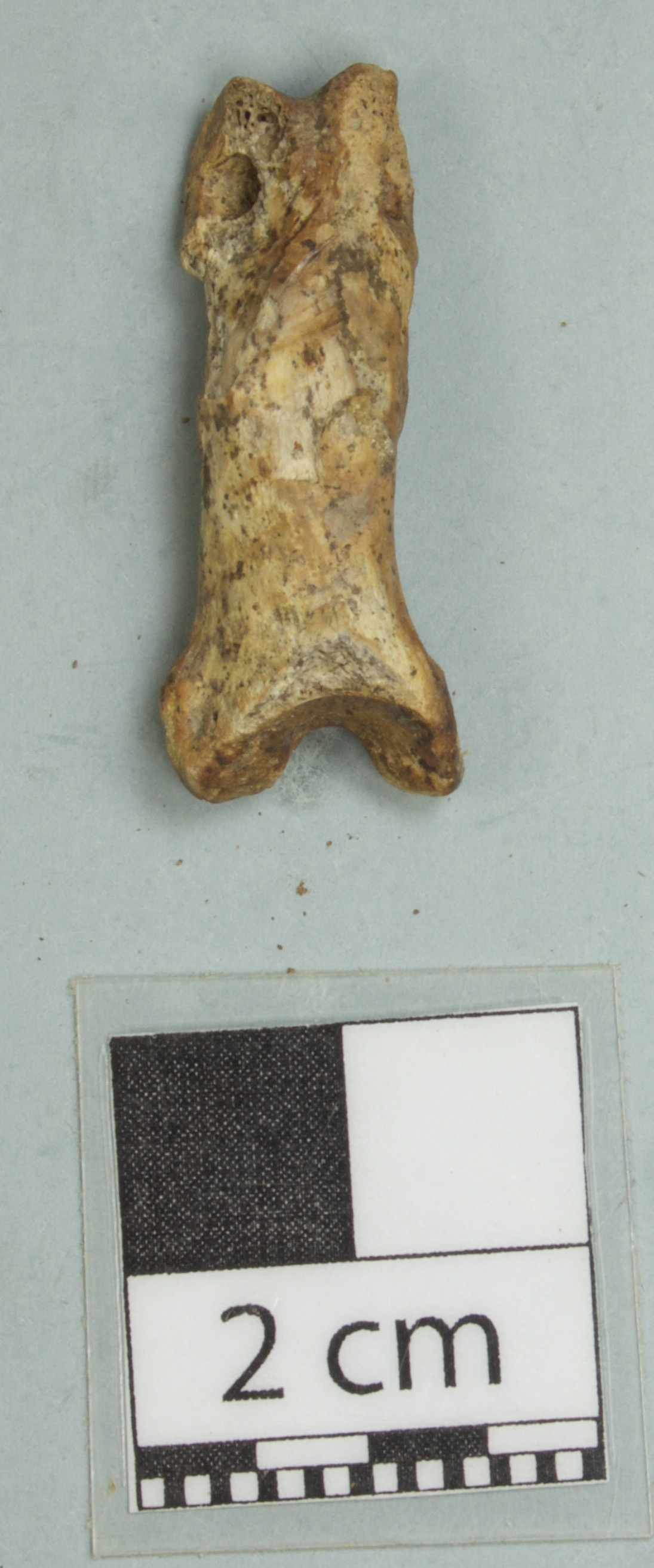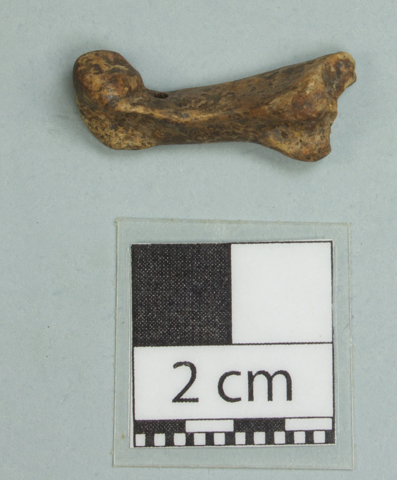 3606 - Hueso metapodiano trabajado de felino, parcialmente restaurado.