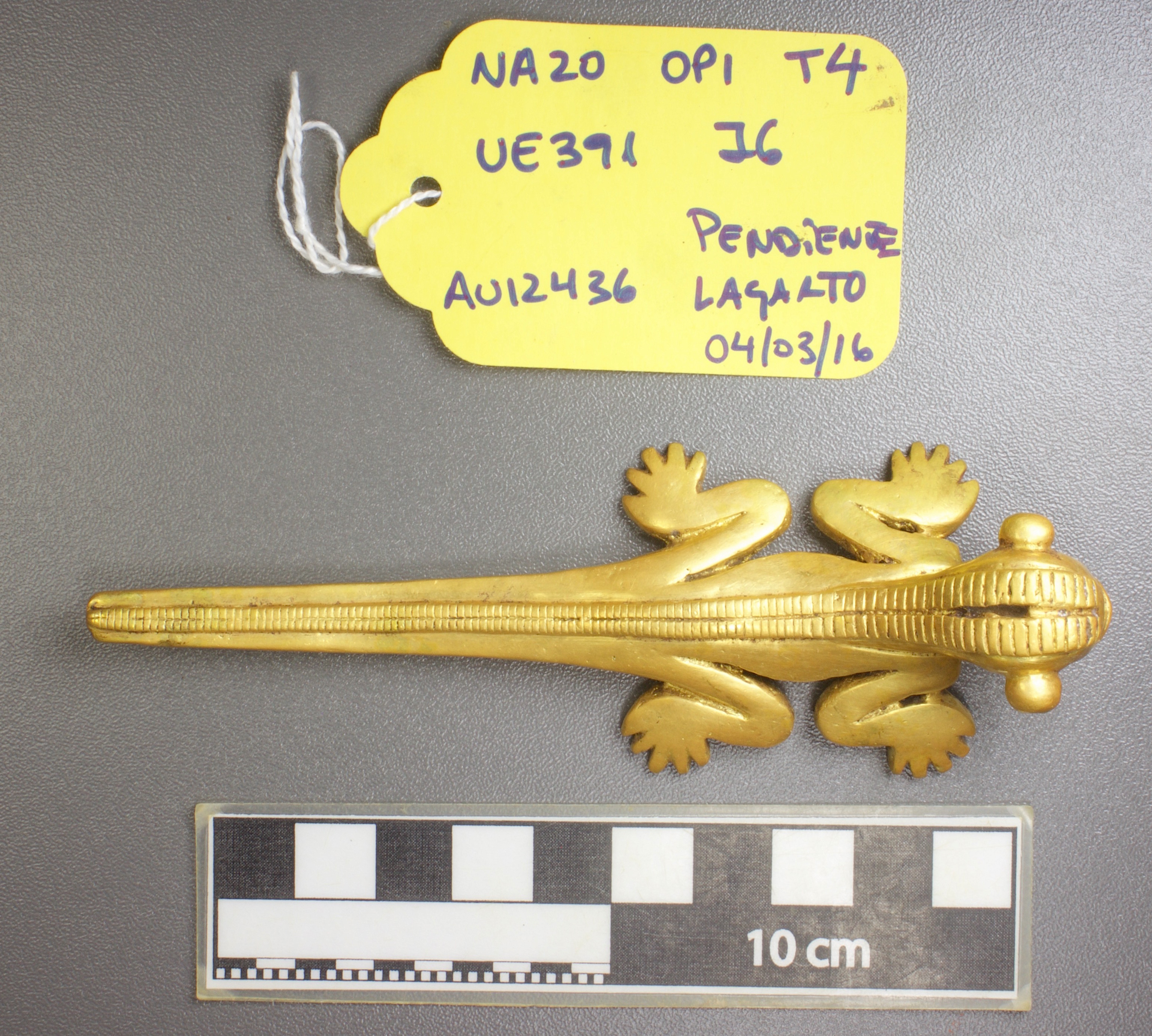 386 - Pectoral discoidal de oro martillado y repujado con la representación de un ser sobrenatural en forma de cocodrilo bicéfalo. Estilo Conte. Tiene cuatro orificios de suspensión alineados ...