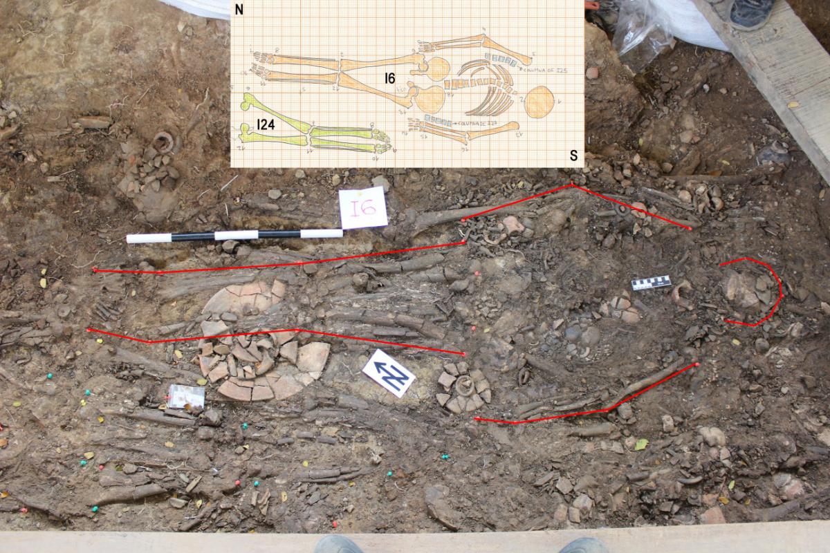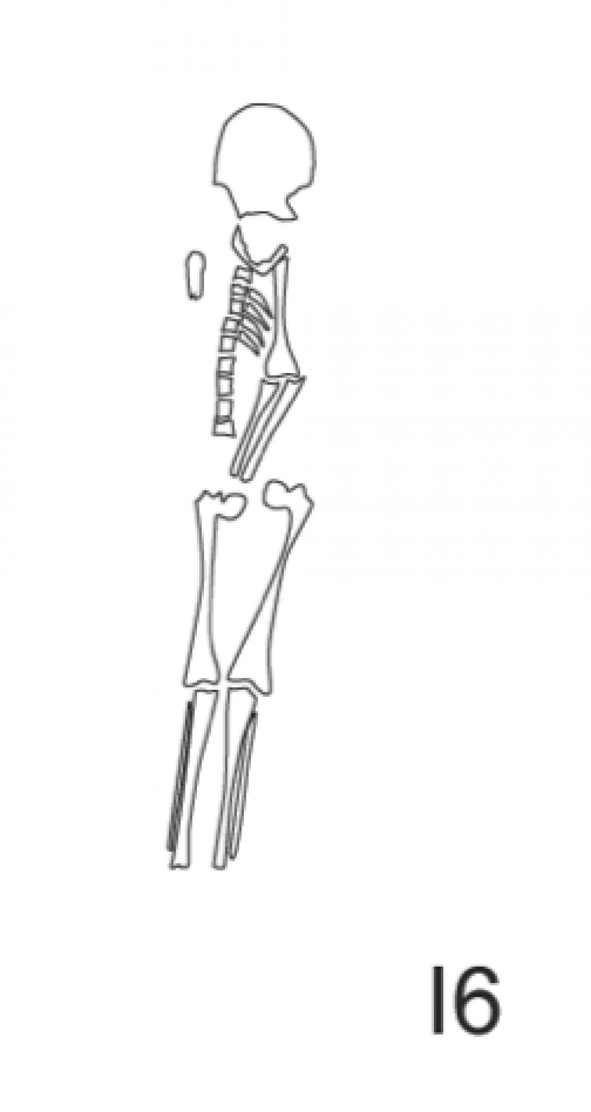 381 - T6-UE125 (a , (llamado en el año 2013, unidad UE167).Entierro de la tumba T6. Depósito de huesos humanos en posición primaria localizado a 3,48 m de profundidad. Es un entierro múltiple...