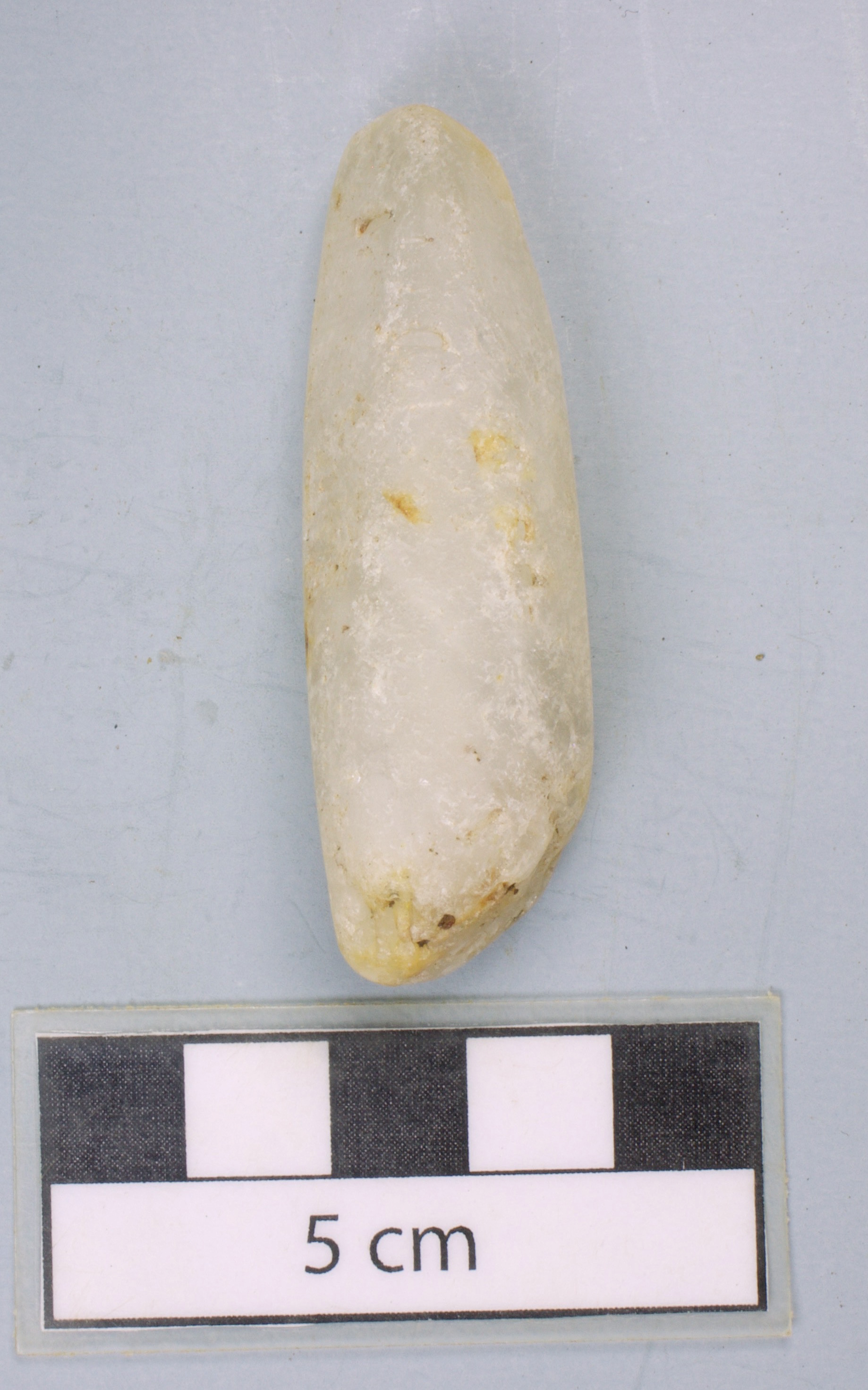 383 - Pendiente de piedra de color ambarino. Es de forma alargada y presenta una perforación.