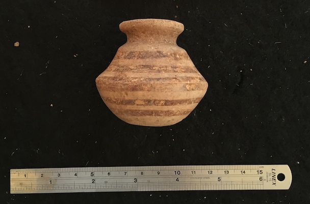 3559 - Jarra cilíndrica de cuello corto, del estilo Conte Policromo, decorada con líneas horizontales.