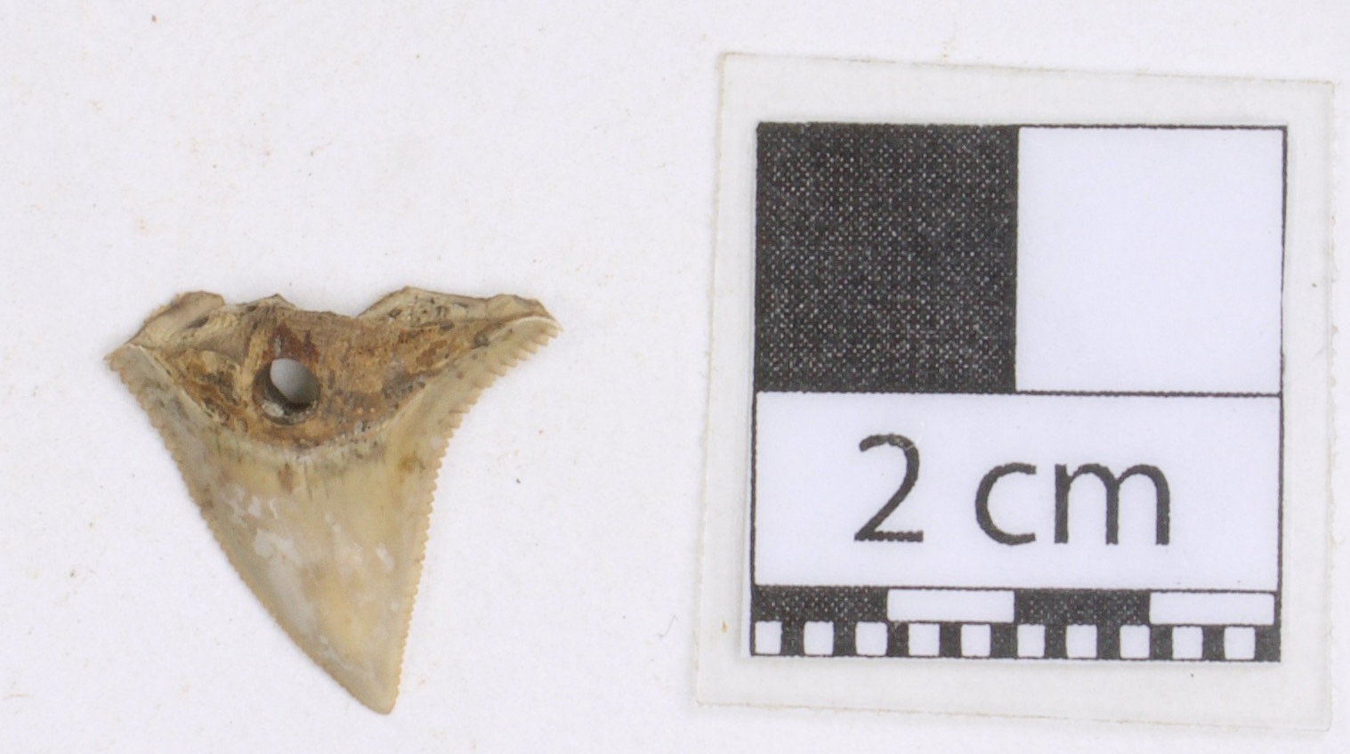 3571 - Diente perforado de tiburón. La perforación indica que pudo haber formado parte de un artefacto ornamental.