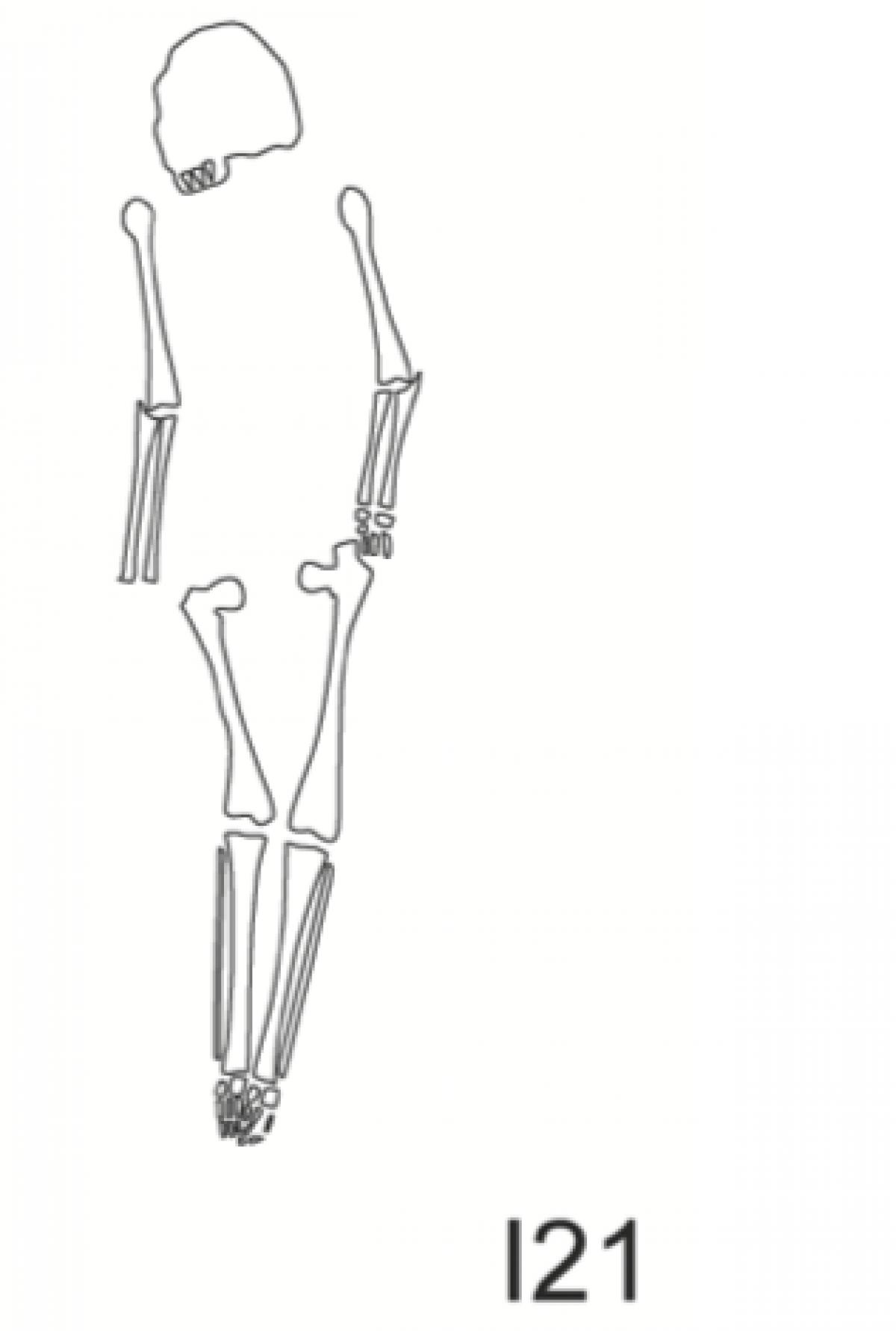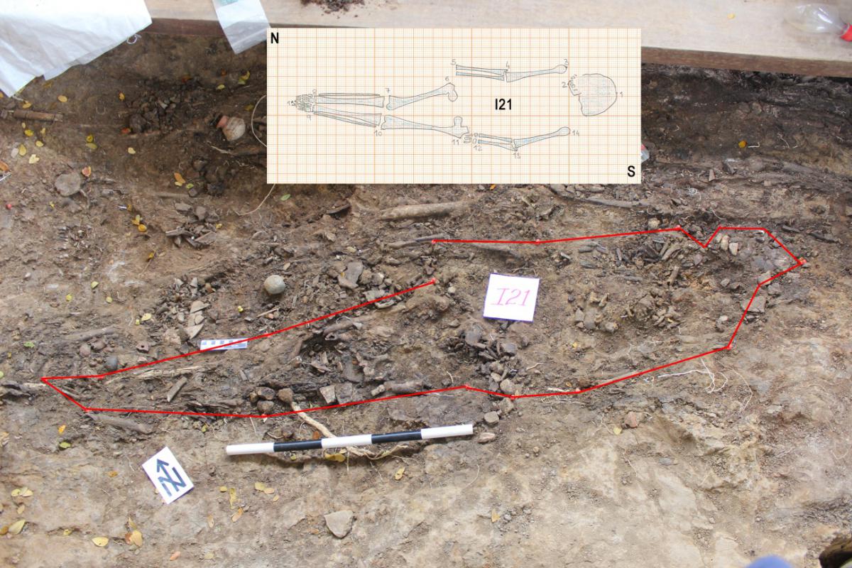 381 - T6-UE125 (a , (llamado en el año 2013, unidad UE167).Entierro de la tumba T6. Depósito de huesos humanos en posición primaria localizado a 3,48 m de profundidad. Es un entierro múltiple...