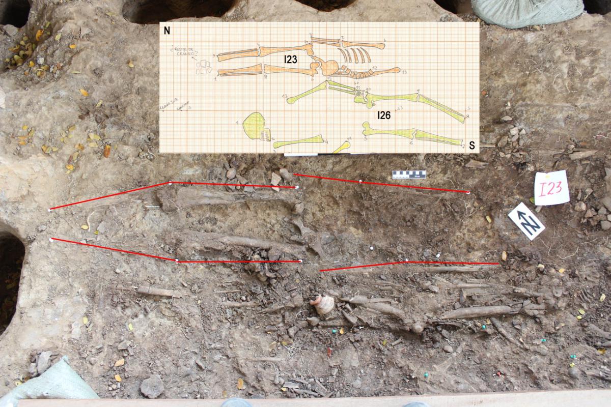381 - T6-UE125 (a , (llamado en el año 2013, unidad UE167).Entierro de la tumba T6. Depósito de huesos humanos en posición primaria localizado a 3,48 m de profundidad. Es un entierro múltiple...