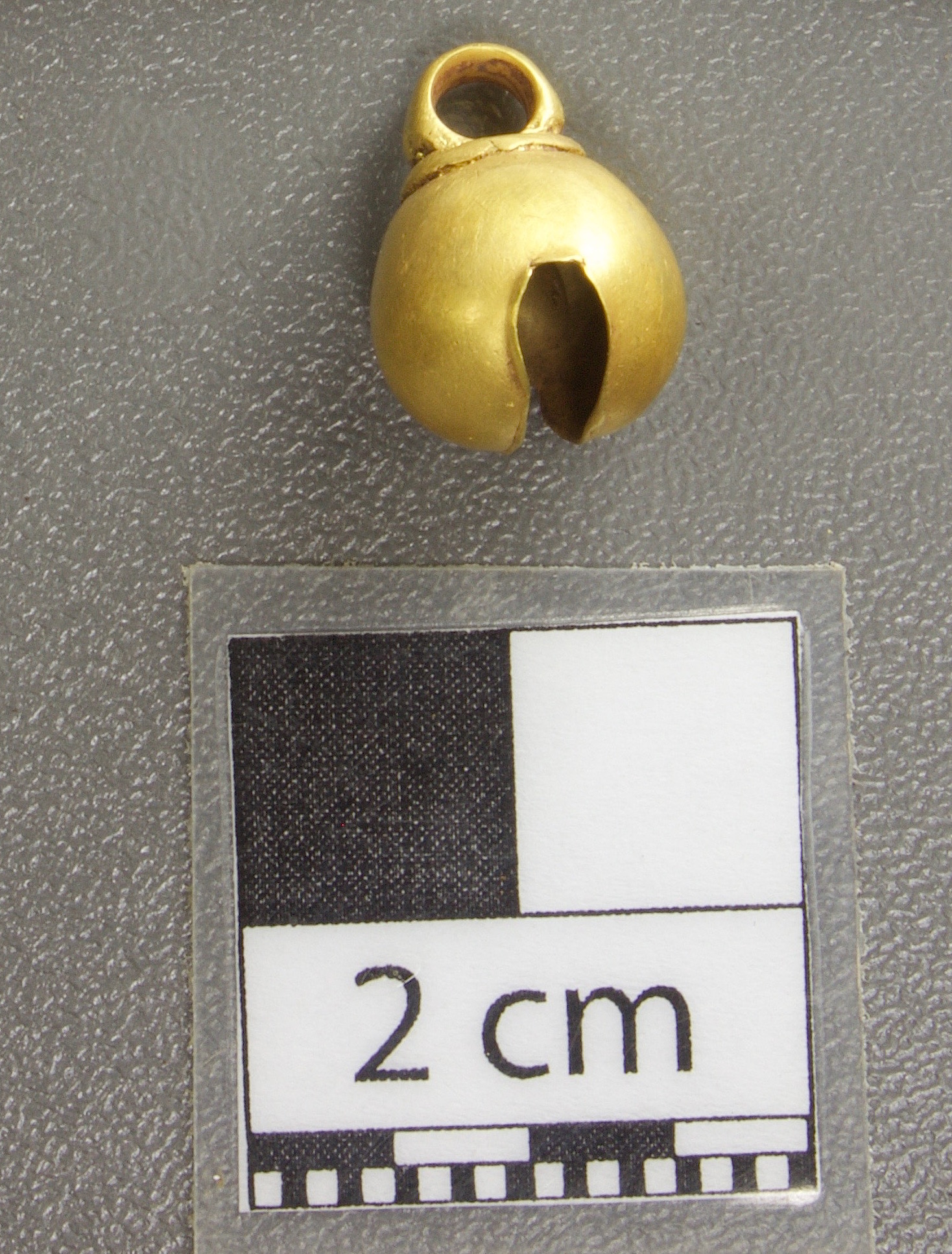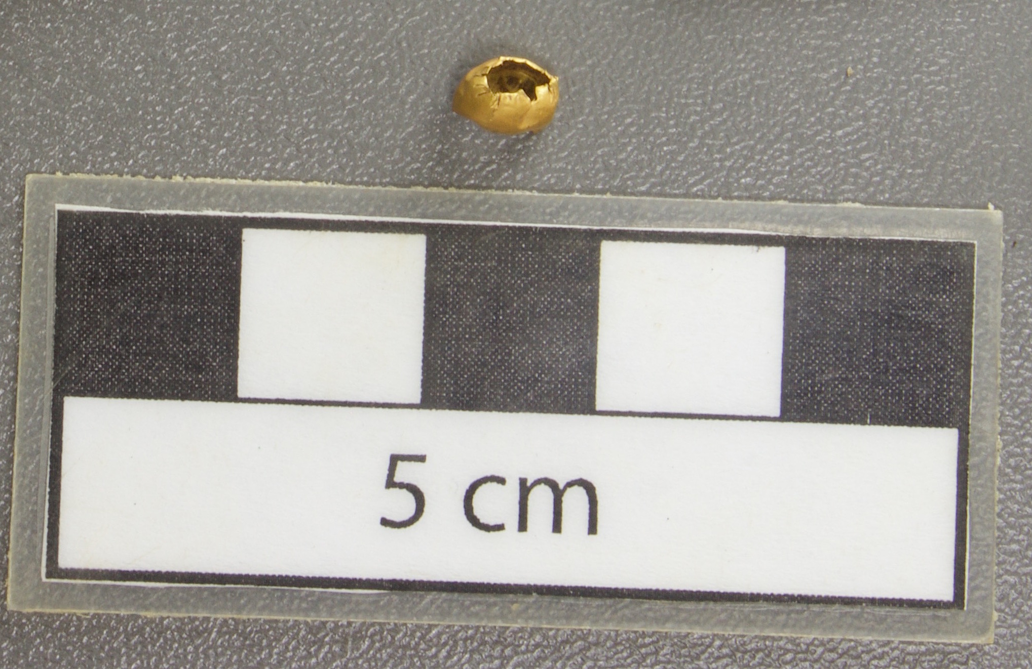 377 - Pendiente figurativo de oro fundido con la representación de un murciélago bicéfalo en vuelo que formaba parte del ajuar del individuo I5 de la tumba T2. EL aro de suspensión se localiza...