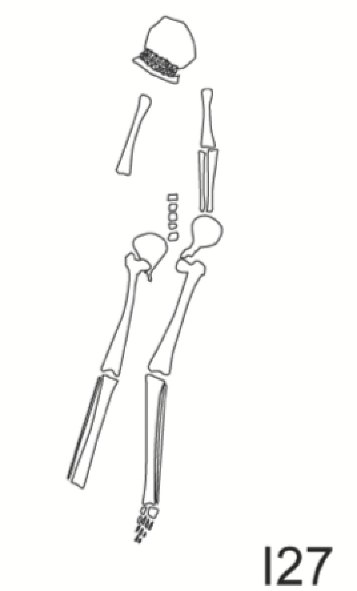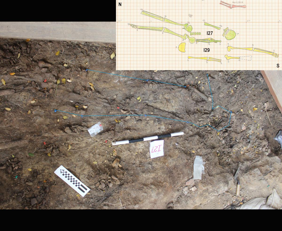 381 - T6-UE125 (a , (llamado en el año 2013, unidad UE167).Entierro de la tumba T6. Depósito de huesos humanos en posición primaria localizado a 3,48 m de profundidad. Es un entierro múltiple...