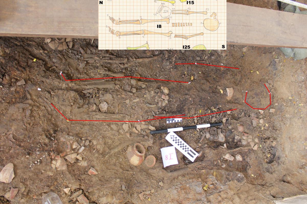 381 - T6-UE125 (a , (llamado en el año 2013, unidad UE167).Entierro de la tumba T6. Depósito de huesos humanos en posición primaria localizado a 3,48 m de profundidad. Es un entierro múltiple...