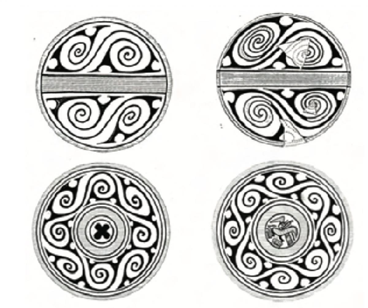 389 - Pectoral discoidal de oro repujado con la representación de un ser sobrenatural híbrido de calamar y ave. Grupo metalúrgico Conte. La figura del calamar, que es la más inmediata, ...