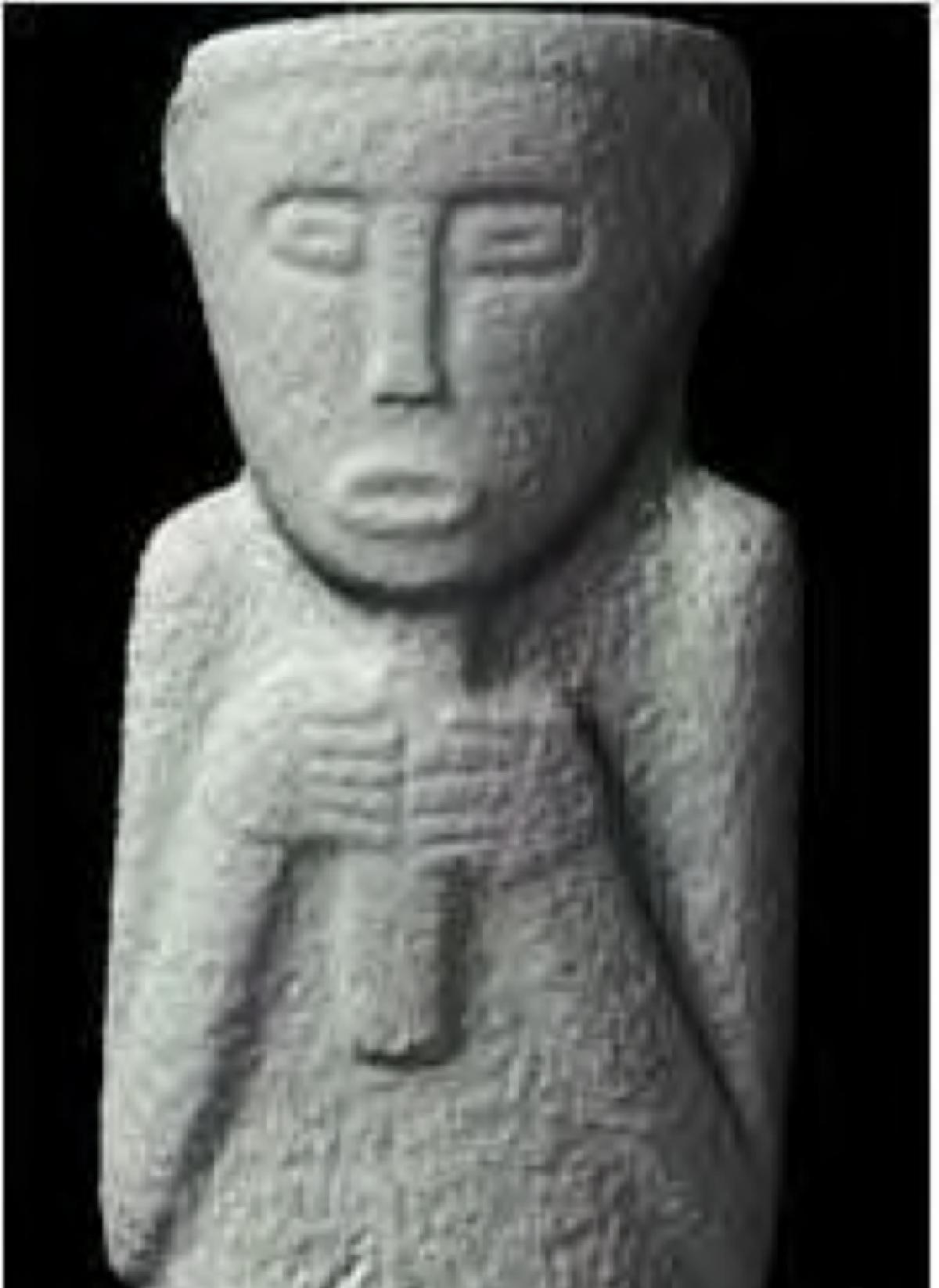 3636 - efigie antropomorfa. Cuerpo de tendencia globular sin base anular y sin asa de apoyo. La decoración en brazos y cara representan con pinturas corporales o tatuajes