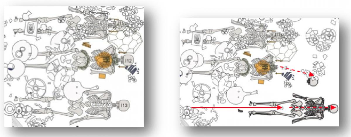 Vista de conjunto de los restos del individuo I12. Segundo nivel de entierro de la tumba T2.
