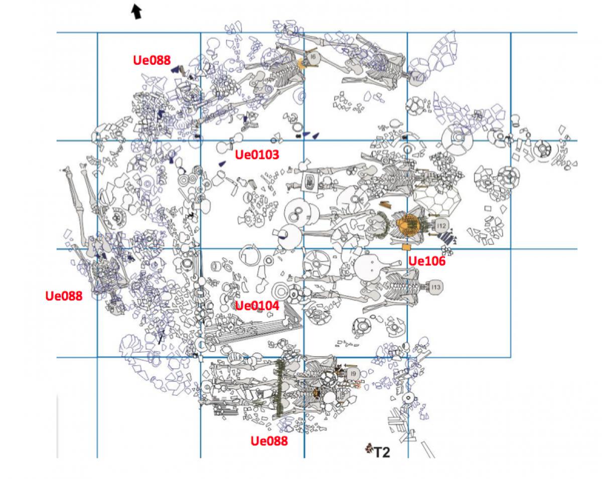 381 - T6-UE125 (a , (llamado en el año 2013, unidad UE167).Entierro de la tumba T6. Depósito de huesos humanos en posición primaria localizado a 3,48 m de profundidad. Es un entierro múltiple...