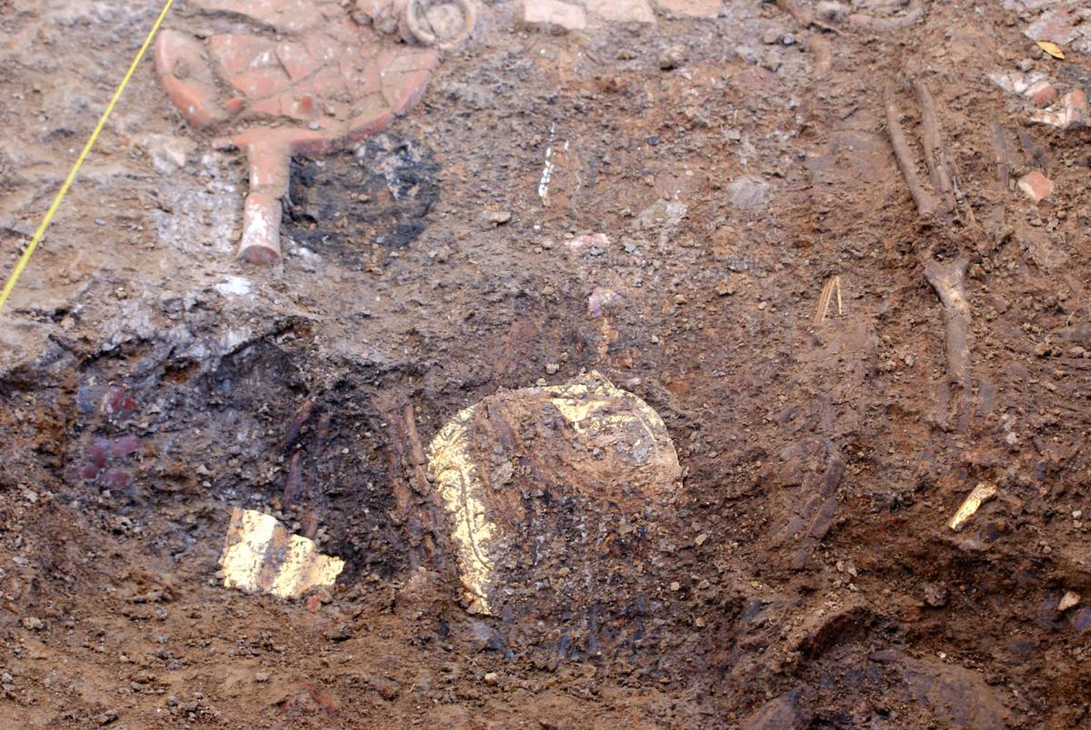387 - Pectoral de oro martillado repujado con la representación frontal del rostro de un ser sobrenatural con rasgos de un anciano que formaba parte del ajuar del Individuo 20, un infante, de la ...