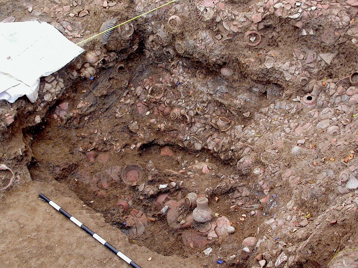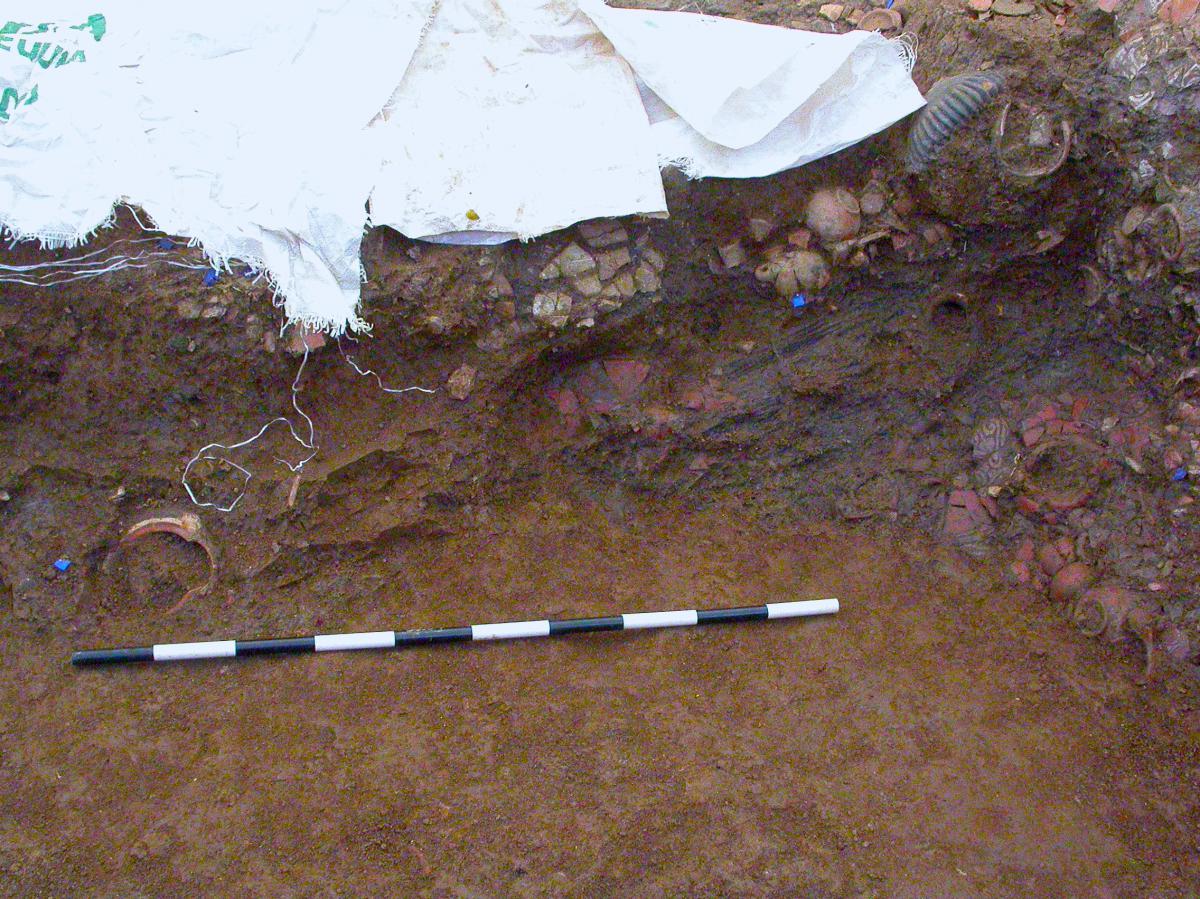 381 - T6-UE125 (a , (llamado en el año 2013, unidad UE167).Entierro de la tumba T6. Depósito de huesos humanos en posición primaria localizado a 3,48 m de profundidad. Es un entierro múltiple...
