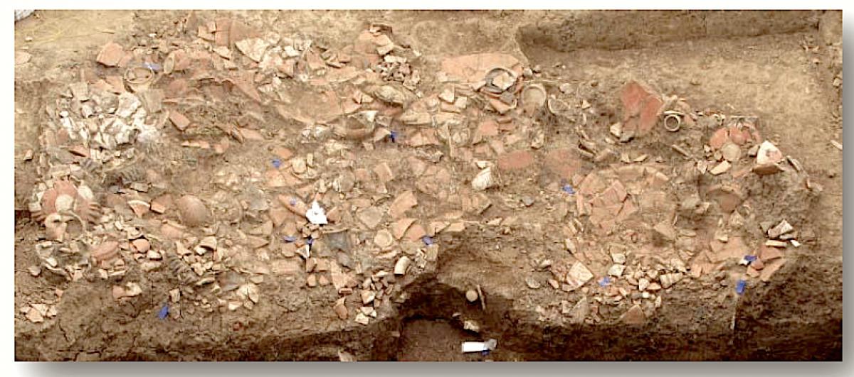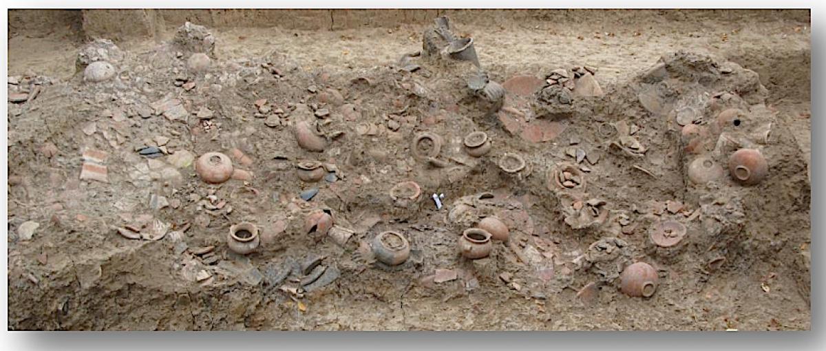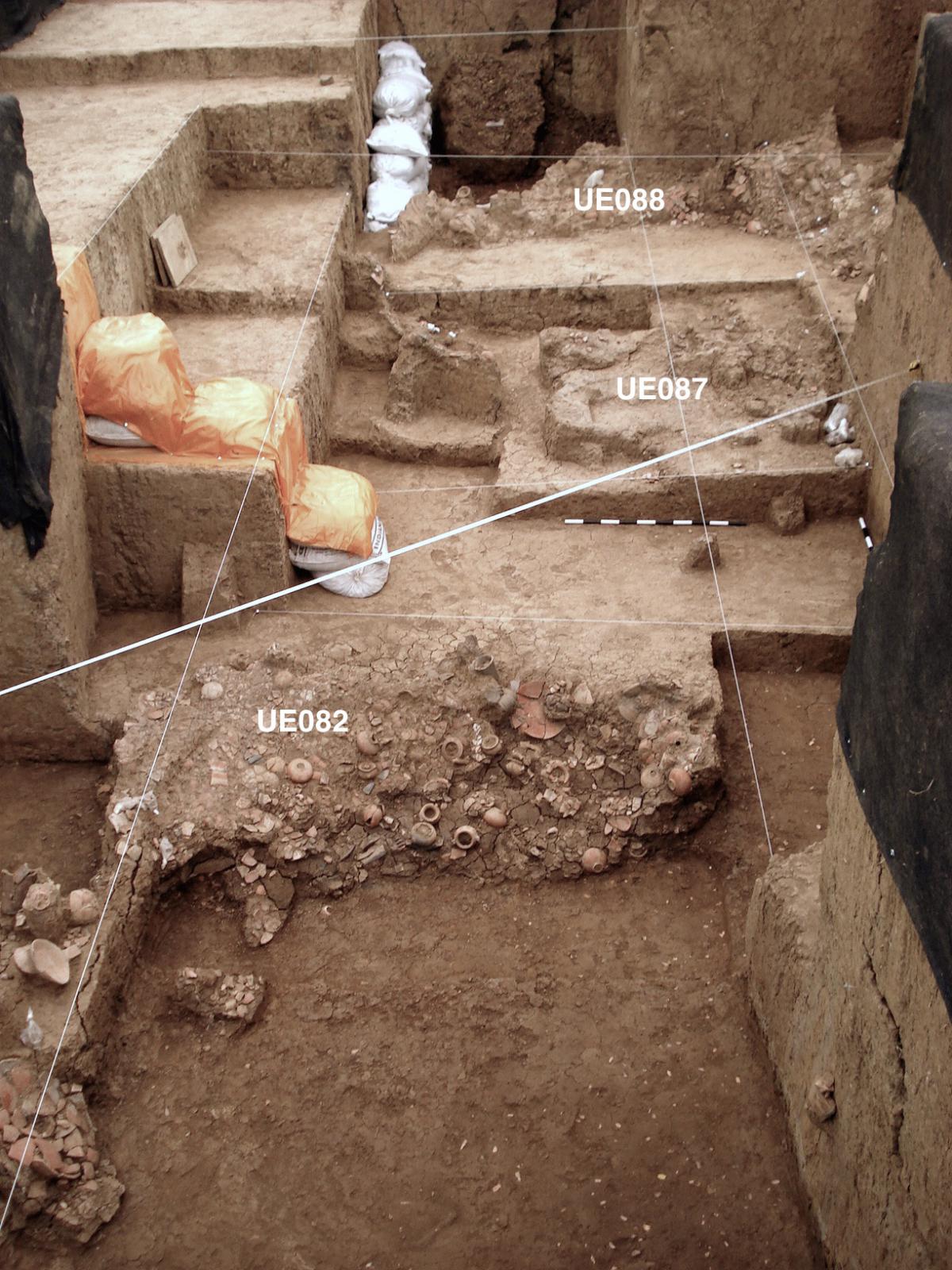 La unidad UE082 contenía al menos dos cuerpos. Éstos fueron cubiertos por platos, ollas y jarras. En esta vista se pueden apreciar las jarras y ollas colocadas sobre los platos.