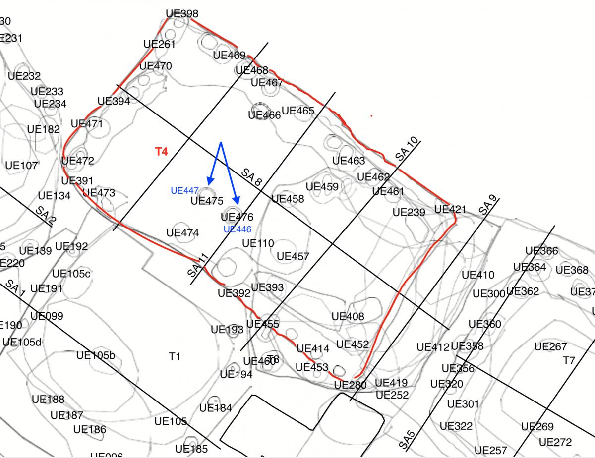 381 - T6-UE125 (a , (llamado en el año 2013, unidad UE167).Entierro de la tumba T6. Depósito de huesos humanos en posición primaria localizado a 3,48 m de profundidad. Es un entierro múltiple...