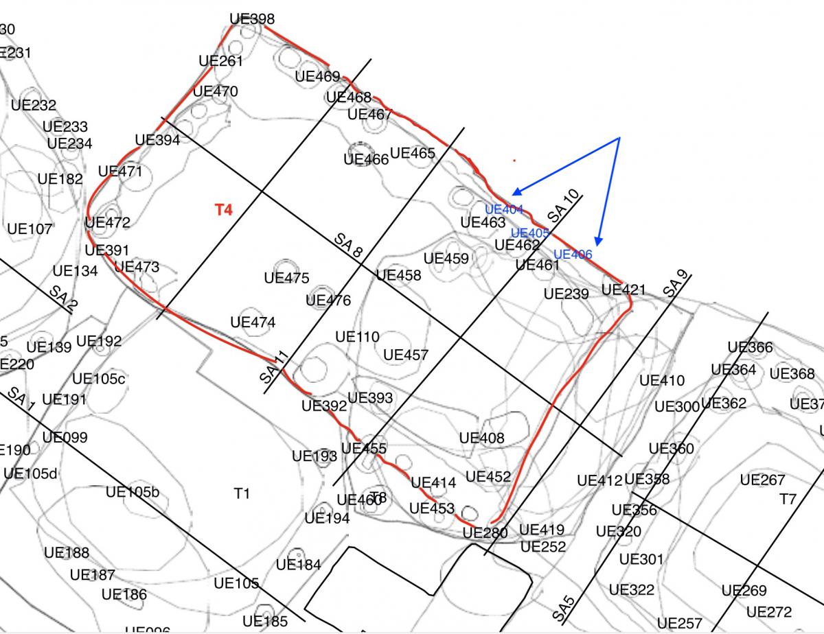 381 - T6-UE125 (a , (llamado en el año 2013, unidad UE167).Entierro de la tumba T6. Depósito de huesos humanos en posición primaria localizado a 3,48 m de profundidad. Es un entierro múltiple...