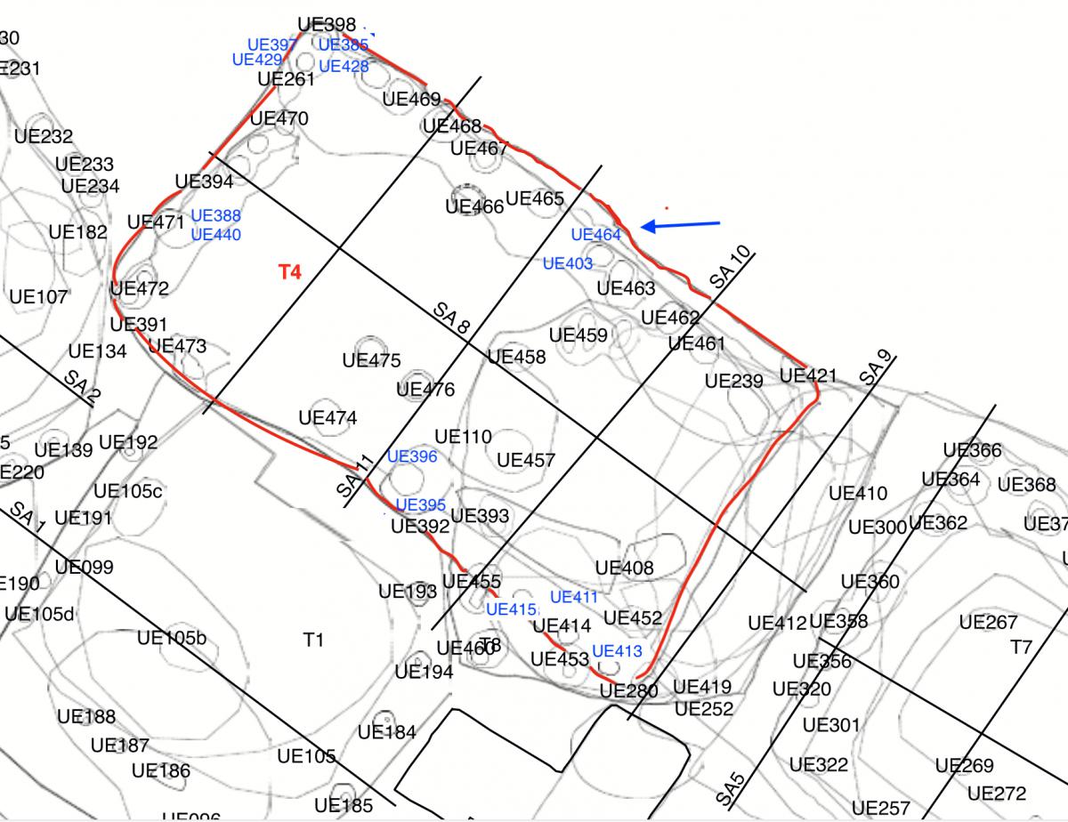 381 - T6-UE125 (a , (llamado en el año 2013, unidad UE167).Entierro de la tumba T6. Depósito de huesos humanos en posición primaria localizado a 3,48 m de profundidad. Es un entierro múltiple...