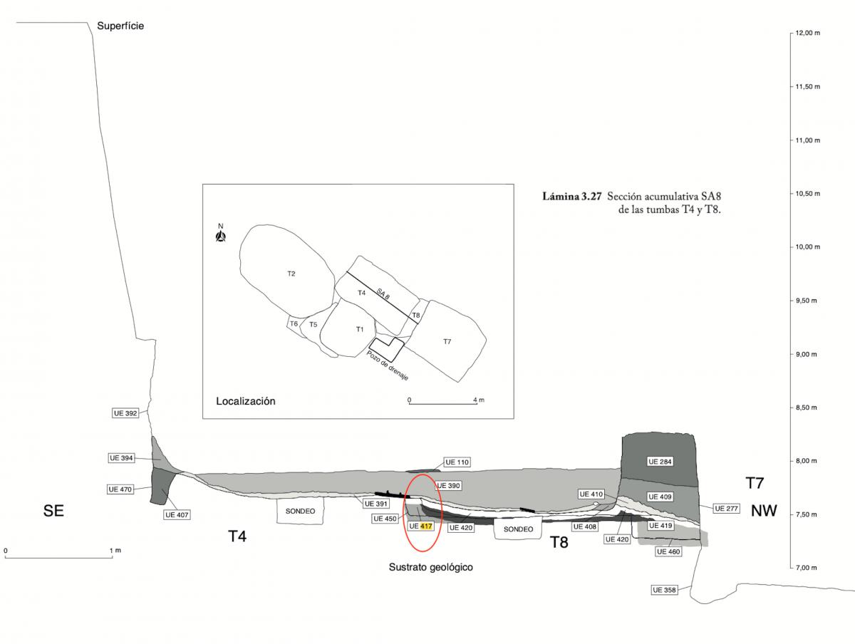 381 - T6-UE125 (a , (llamado en el año 2013, unidad UE167).Entierro de la tumba T6. Depósito de huesos humanos en posición primaria localizado a 3,48 m de profundidad. Es un entierro múltiple...