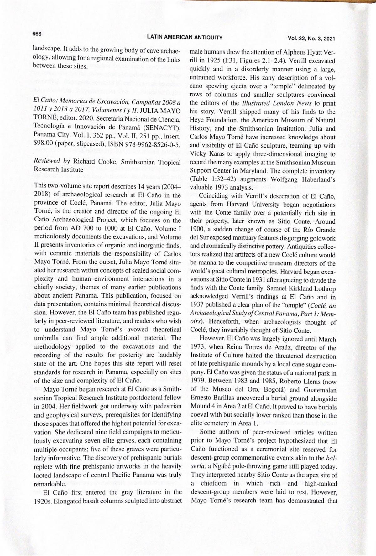 Página 1 de la reseña de estas memorias de excavación escrita por el Dr. Richard Cooke, del Smithsonian Tropical Research Institute, y publicada en la revista Latin American Antiquity en su número de septiembre de 2021.