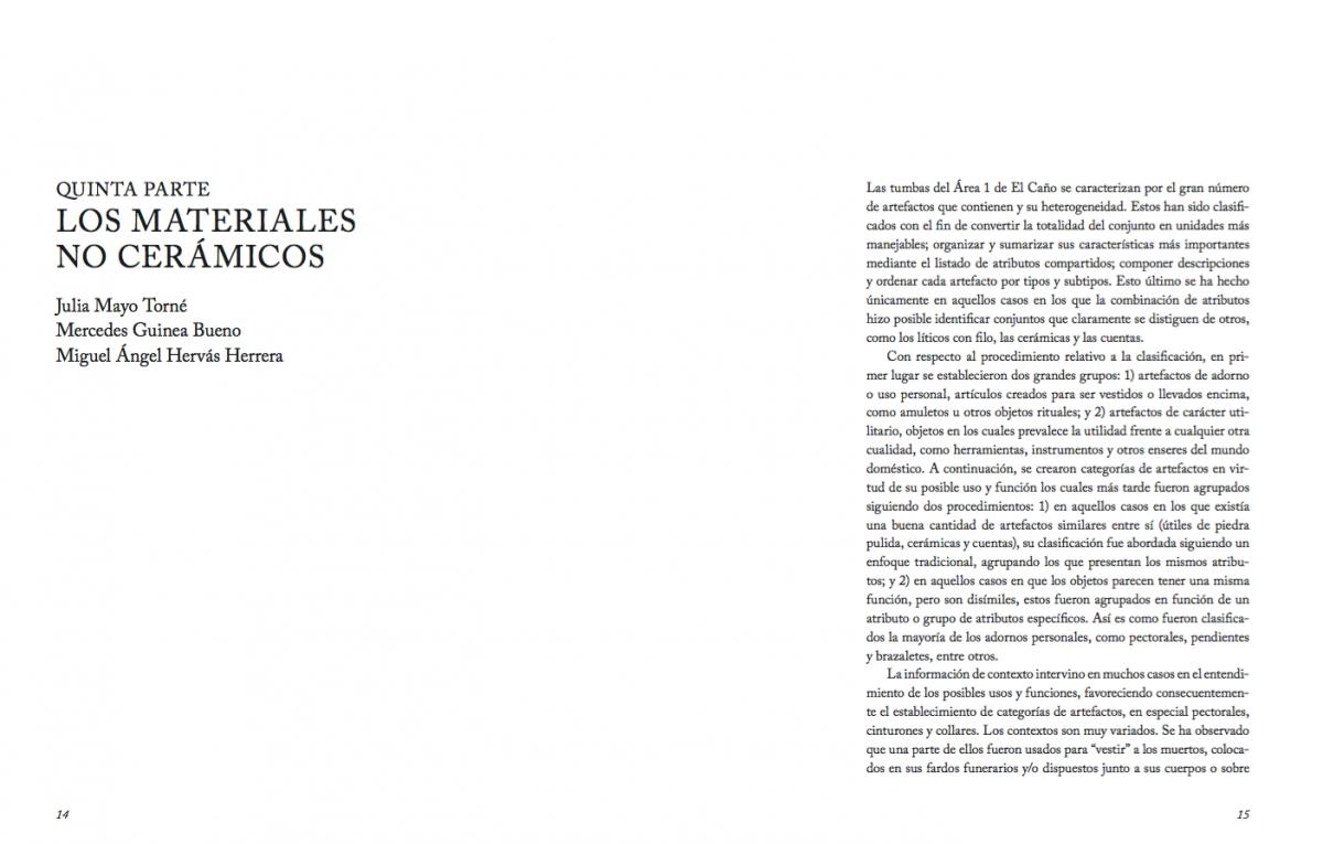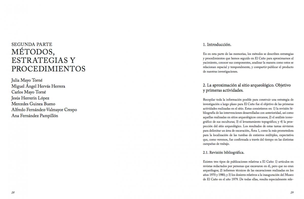 Documento pdf con el índice completo (ocho páginas) de la obra: "El Caño. Memorias de Excavación. Campañas 2008 a 2011 y 2013 a 2017, Volumen I y II"