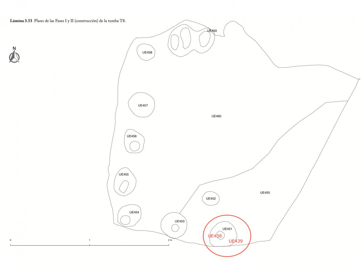 388 - T2-UE106 (a. Entierro múltiple de la tumba T2. Depósito de forma rectangular, orientado NO-SE, formado por tres osamentas (I11, I12 e I13). El espesor del depósito es de 0,33 m. Los cuerp...