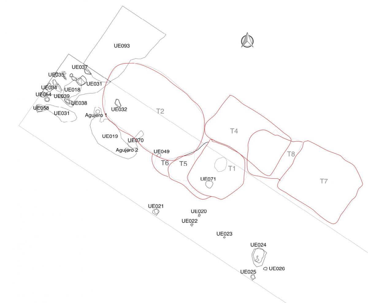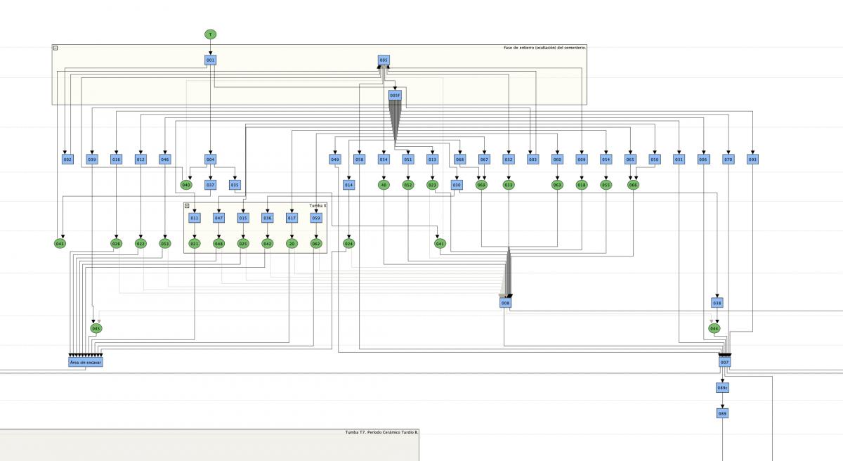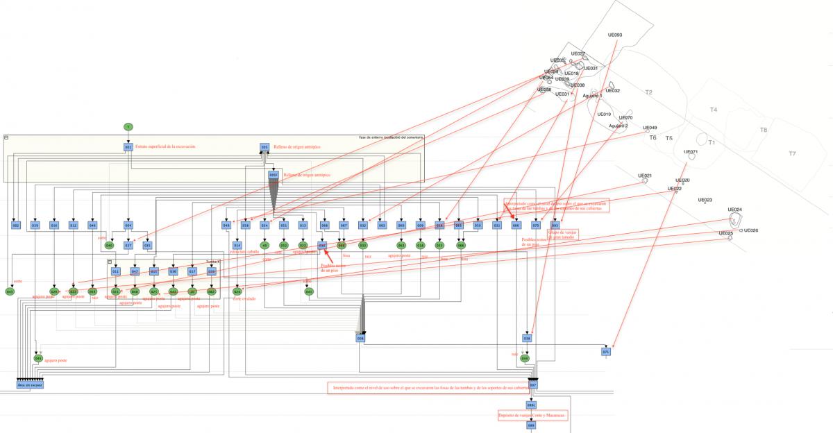 Algunas relaciones entre el mapa de UEs superficiales y su representación en la matriz de Harris. Nótese la no discontinuidad de la relación entre las unidades estratigráficas superficiales, representadas en la matriz de Harris como elementos constructivos superficiales -cortes de agujeros de poste, fosas y sus depósitos de relleno-, y el contorno de las tumbas, especialmente en el caso de la T2, que fue la primera tumba que se localizó.