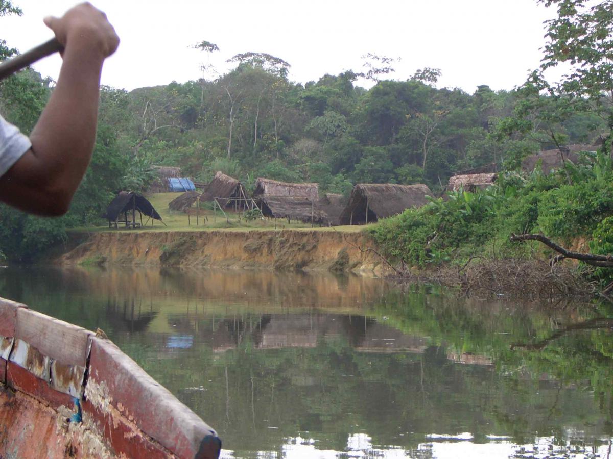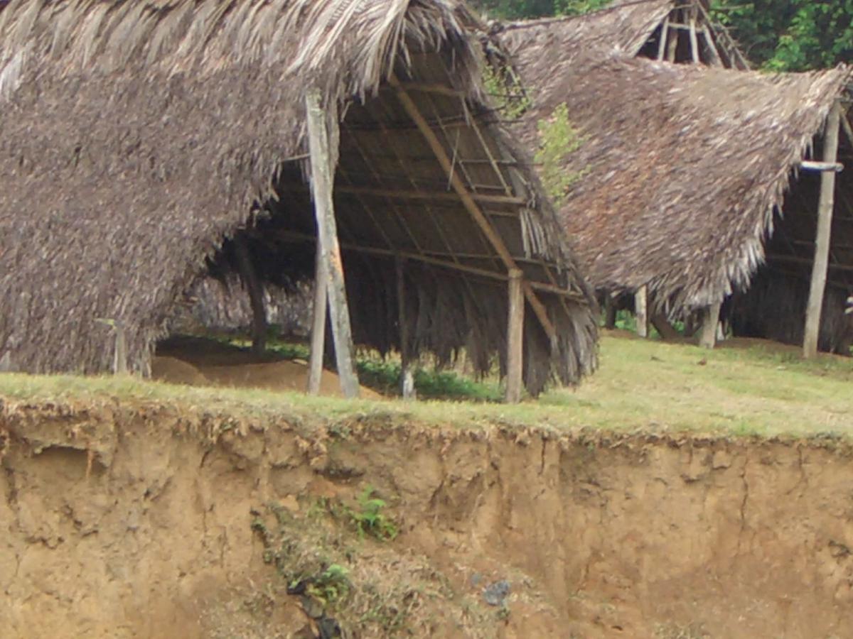 Detalle de las construcciones en superficie de un cementerio kuna actual. Vista tomada desde el río.