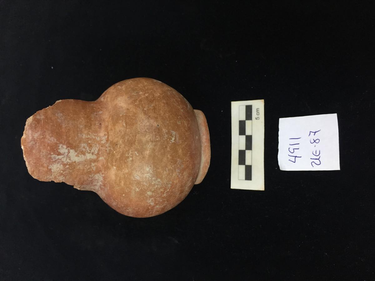3619 - Olla globular de línea roja, sin soporte y con asa en el cuerpo.