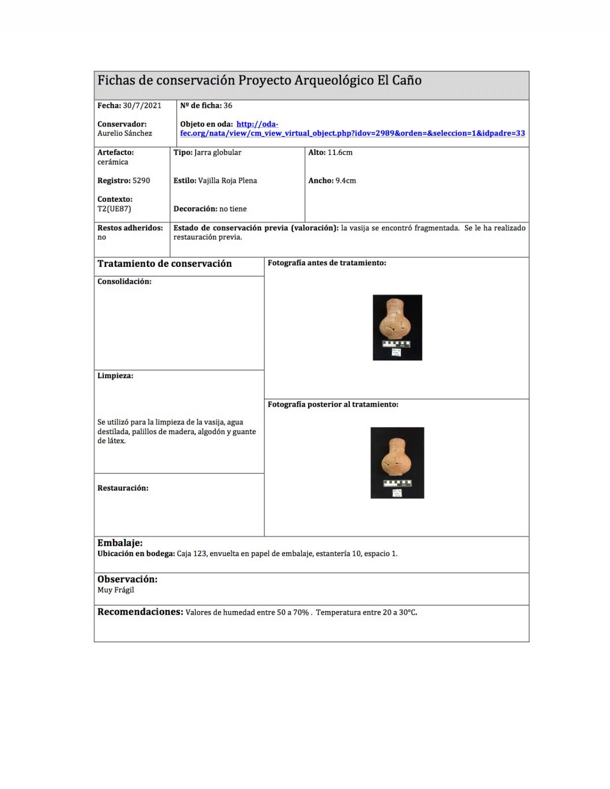 Ficha de conservación del objeto.