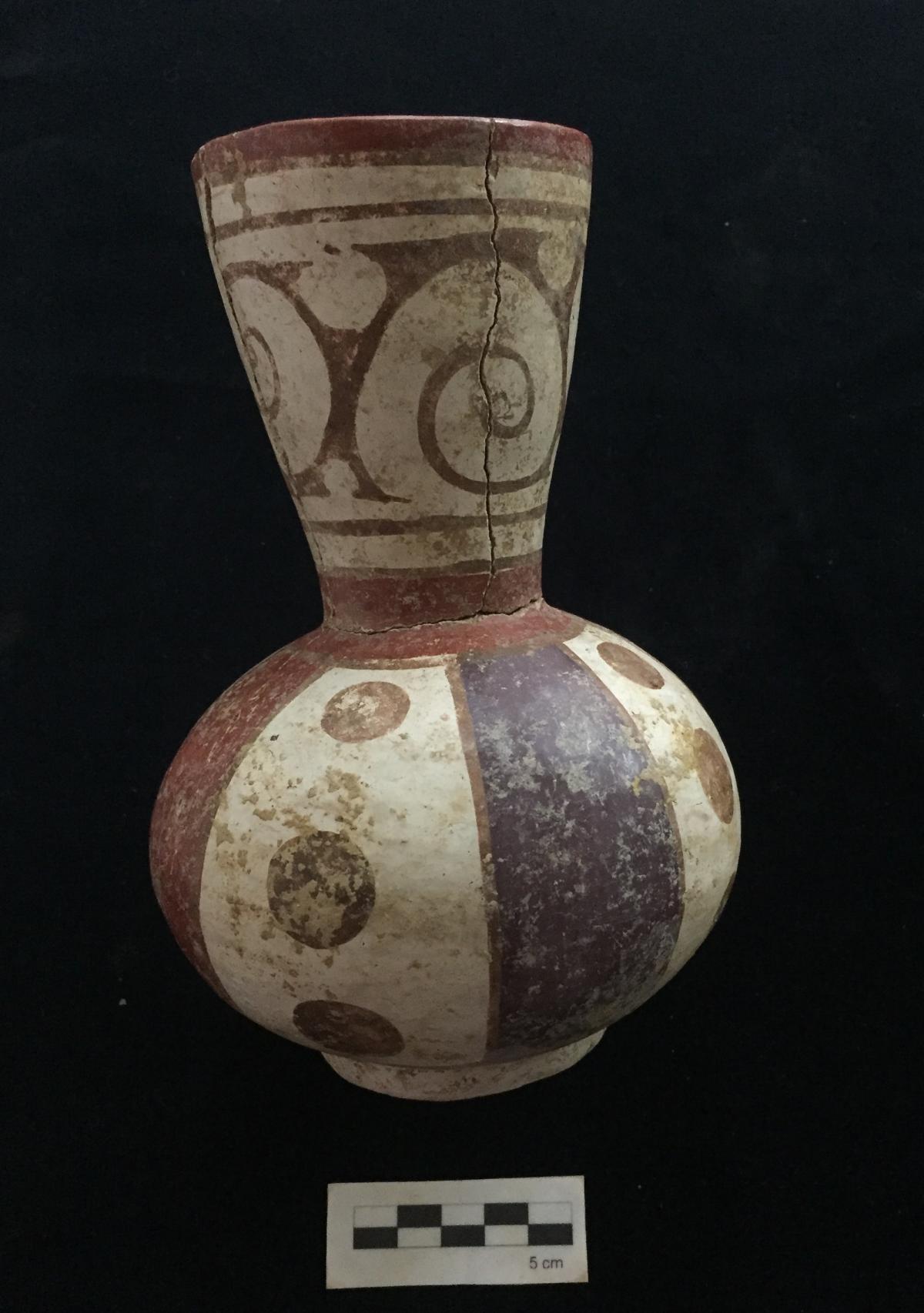 376 - Jarra polícroma carenada con hombros alzados y cuello largo. Engobe blanco y decoración de bandas de color alternas rojas y moradas.