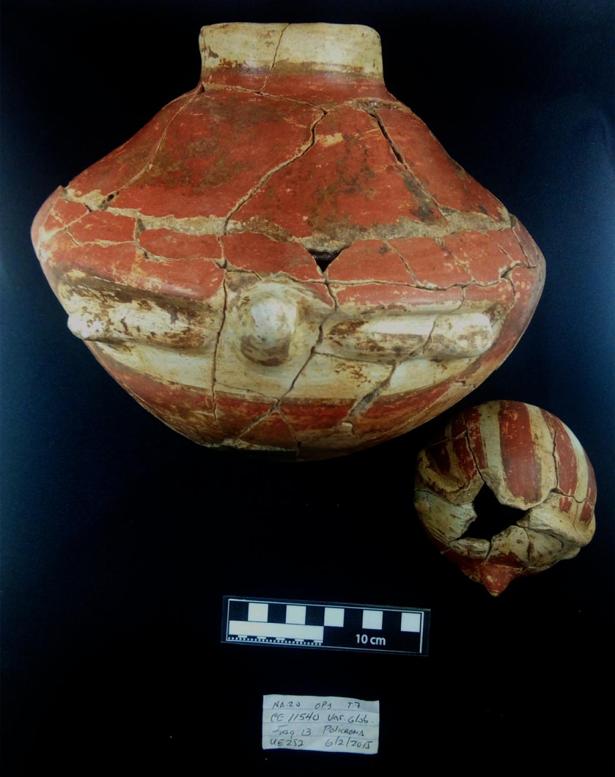 376 - Jarra polícroma carenada con hombros alzados y cuello largo. Engobe blanco y decoración de bandas de color alternas rojas y moradas.