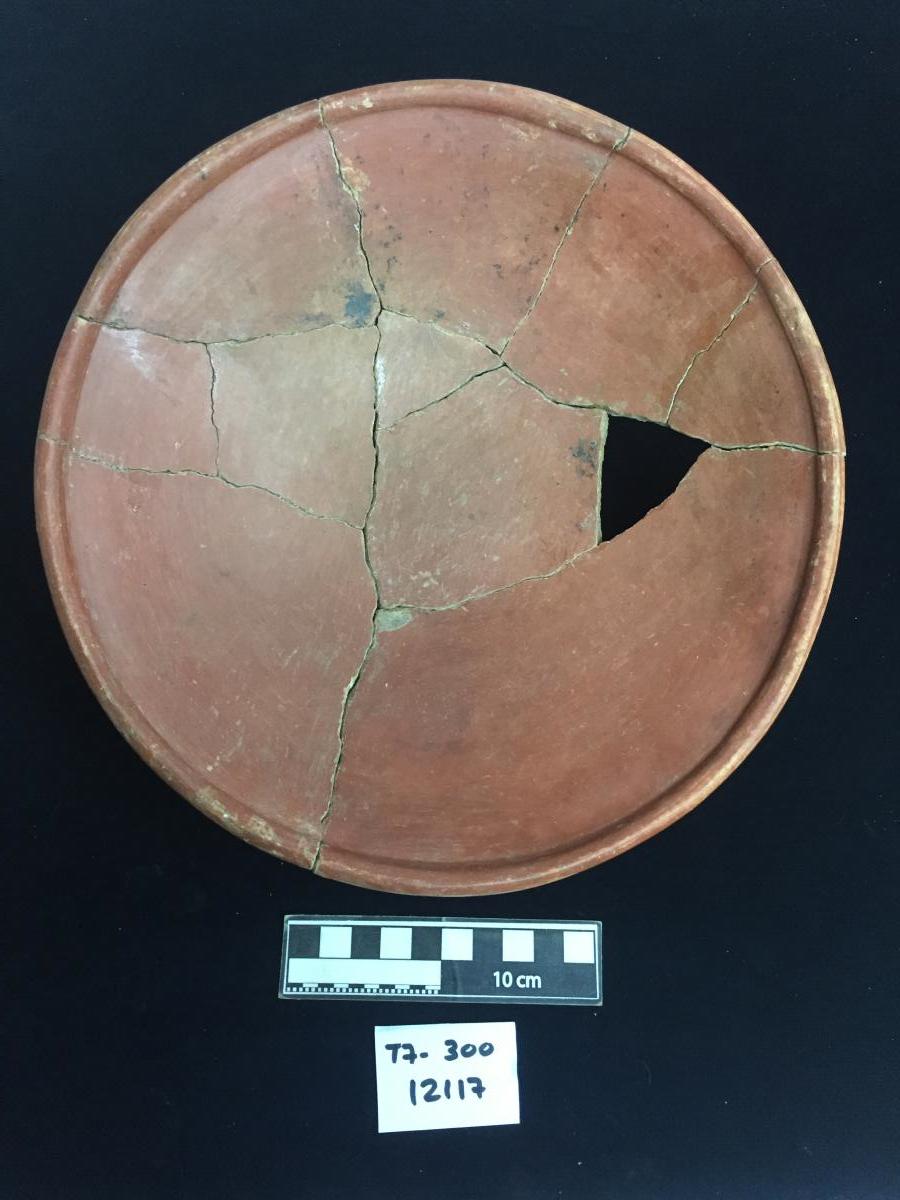 385 - Plato polícromo de borde engrosado exterior. Doble engobe (blanco en el anverso y rojo en el reverso) y decoración en bandas de color alternas zigzagueantes (rojo y morado).