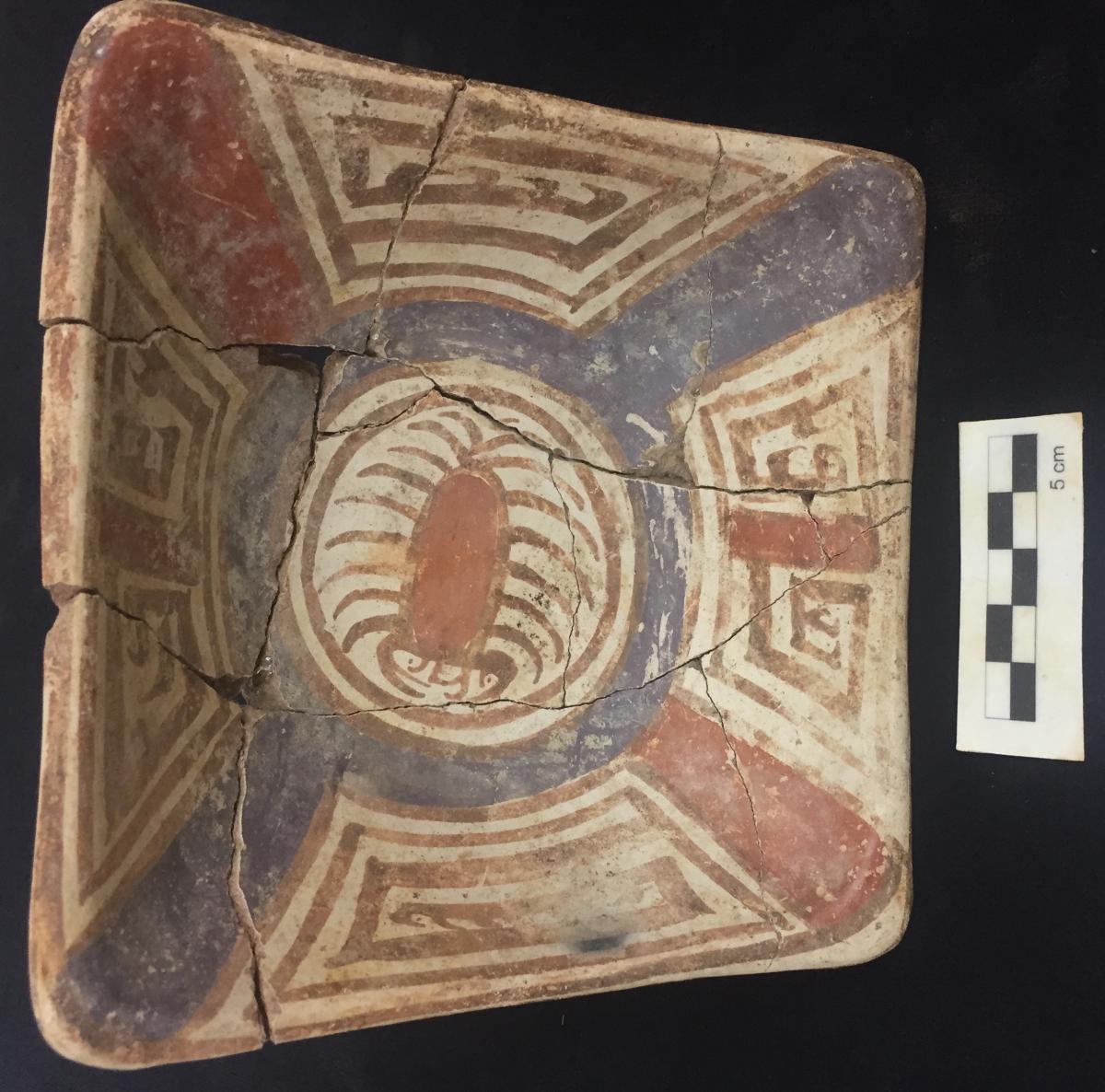 3650 - Cuenco de base plana, con paredes ligeramente convexas y borde redondeado. Presenta engobe rojo en el exterior y blanco en el interior, con decoración en rojo y morado. En el panel central ...