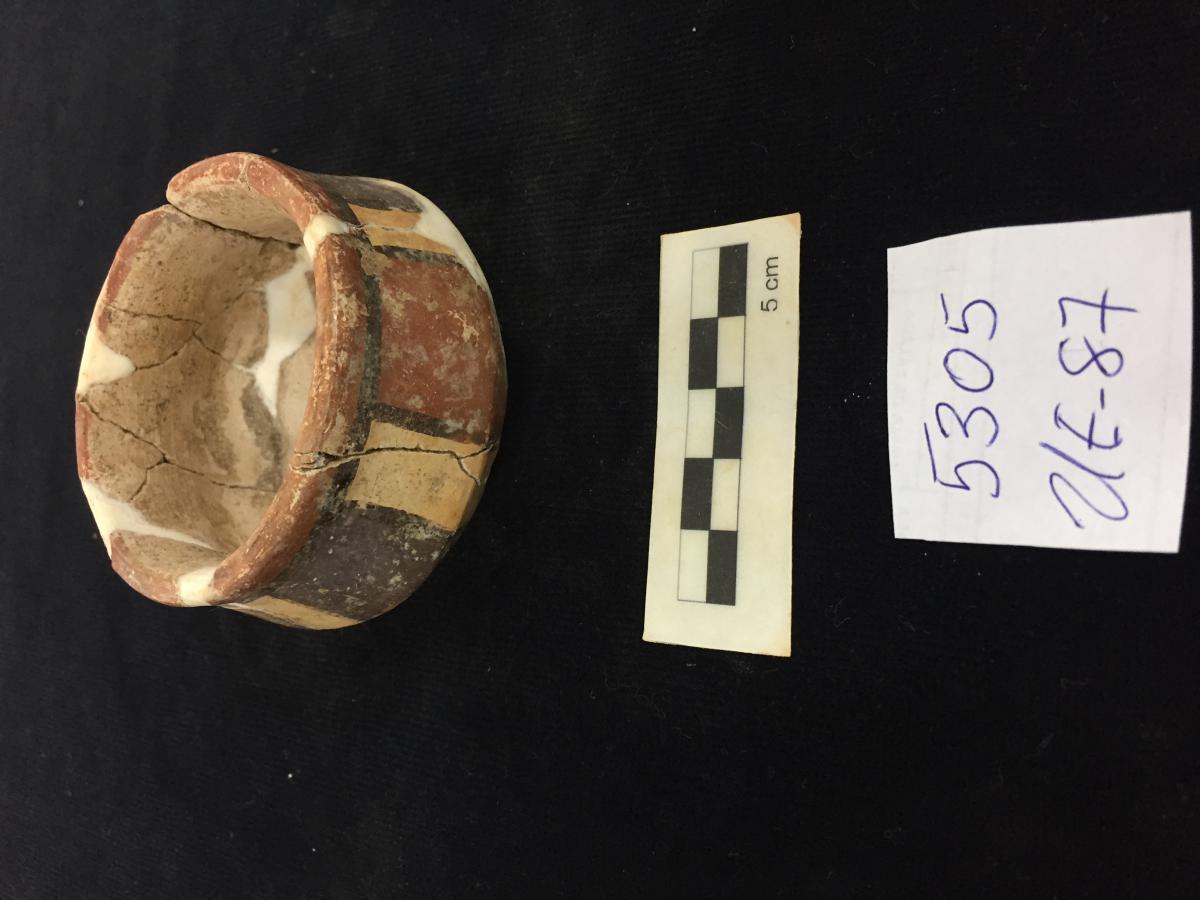 3656 - Cuenco policromo con base anular y borde engrosado, decorado con motivos geométricos en forma de “X” y “V”.