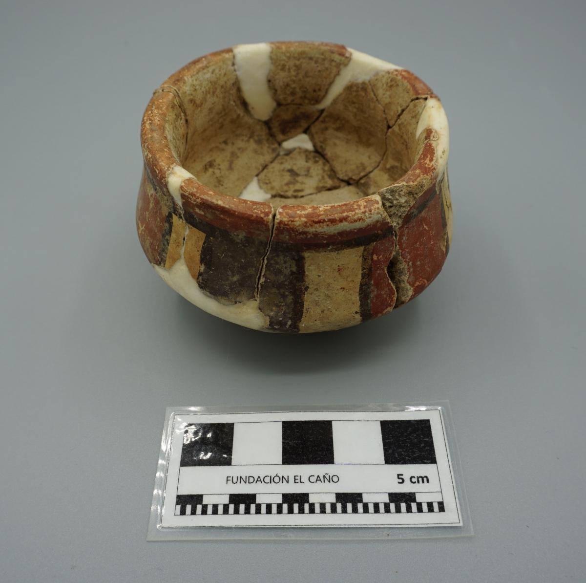 3637 - Cuenco policromo con pedestal, cuerpo de contorno cuadrado y borde engrosado. La superficie interna presenta un color crema, mientras que la externa está decorada con bandas verticales en t...