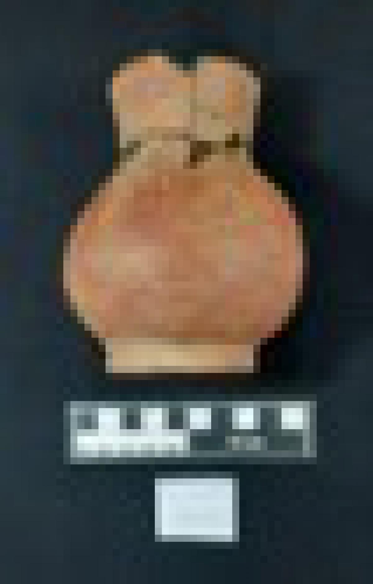 3643 - Efigie zoomorfa biglobular con base anular y una decoración de bandas rojas y moradas sobre el cuerpo, dispuestas de modo que resaltan el color blanco del engobe subyacente (forma de tigre)...