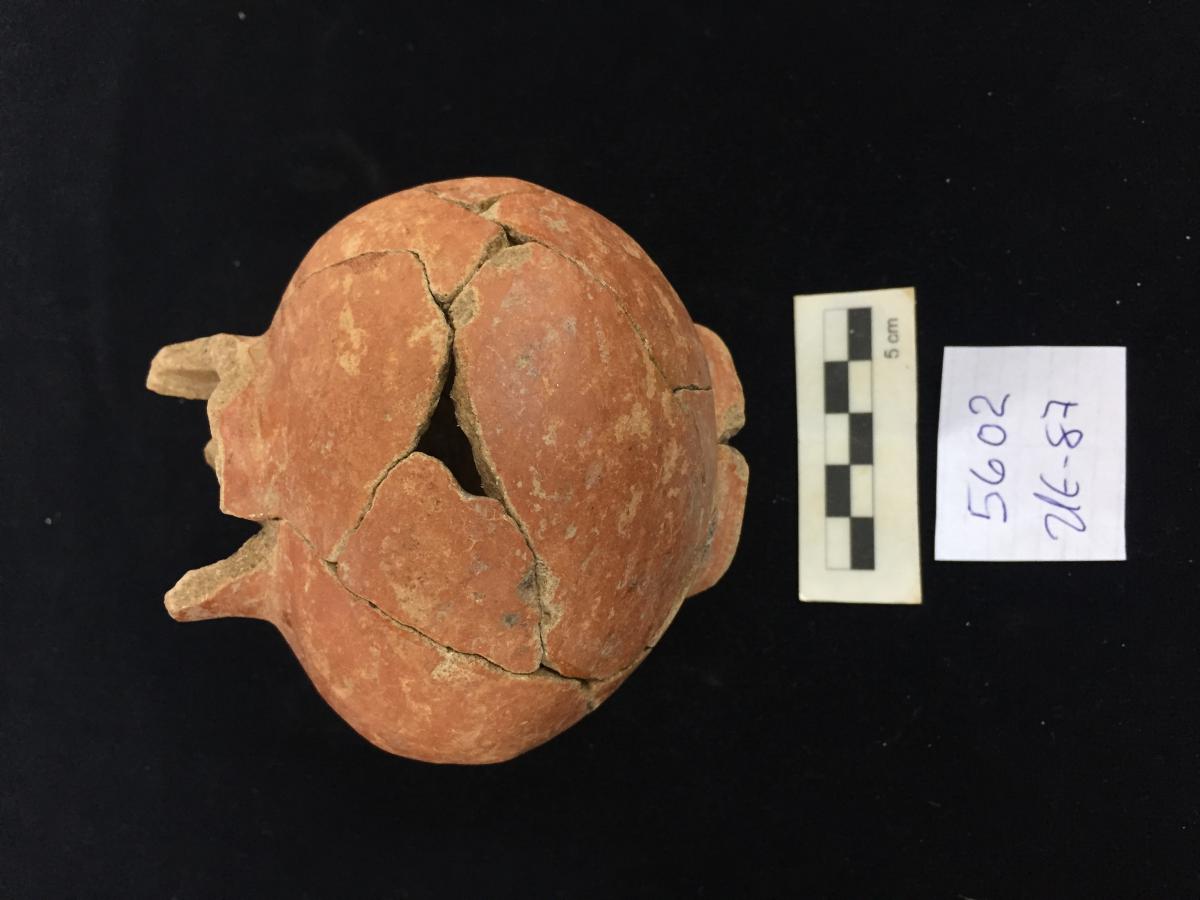 3609 - Olla globular sin soporte, con línea roja, asa en el cuerpo y borde en envesado.
