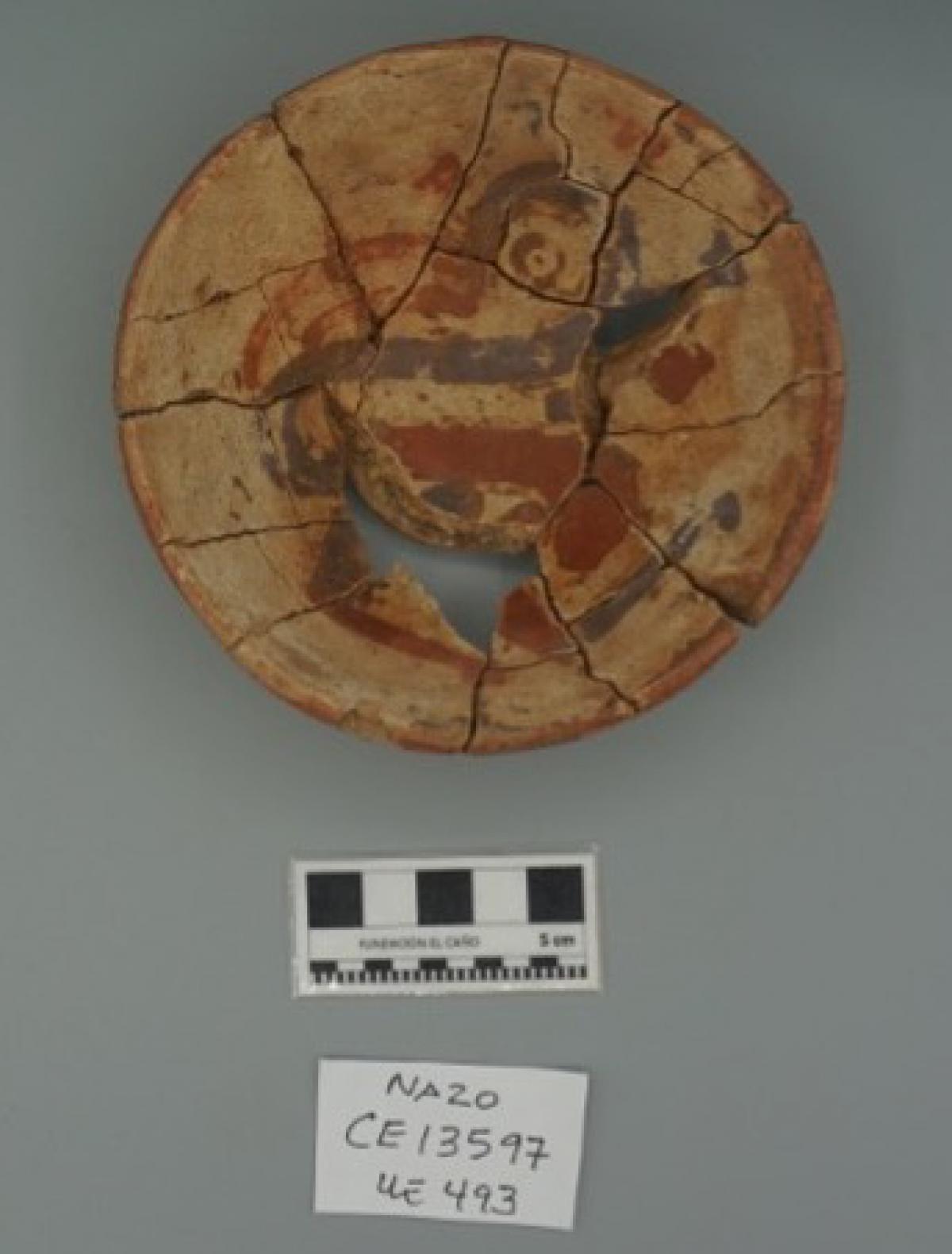 385 - Plato polícromo de borde engrosado exterior. Doble engobe (blanco en el anverso y rojo en el reverso) y decoración en bandas de color alternas zigzagueantes (rojo y morado).