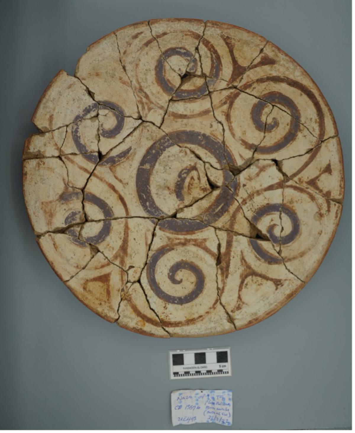 385 - Plato polícromo de borde engrosado exterior. Doble engobe (blanco en el anverso y rojo en el reverso) y decoración en bandas de color alternas zigzagueantes (rojo y morado).