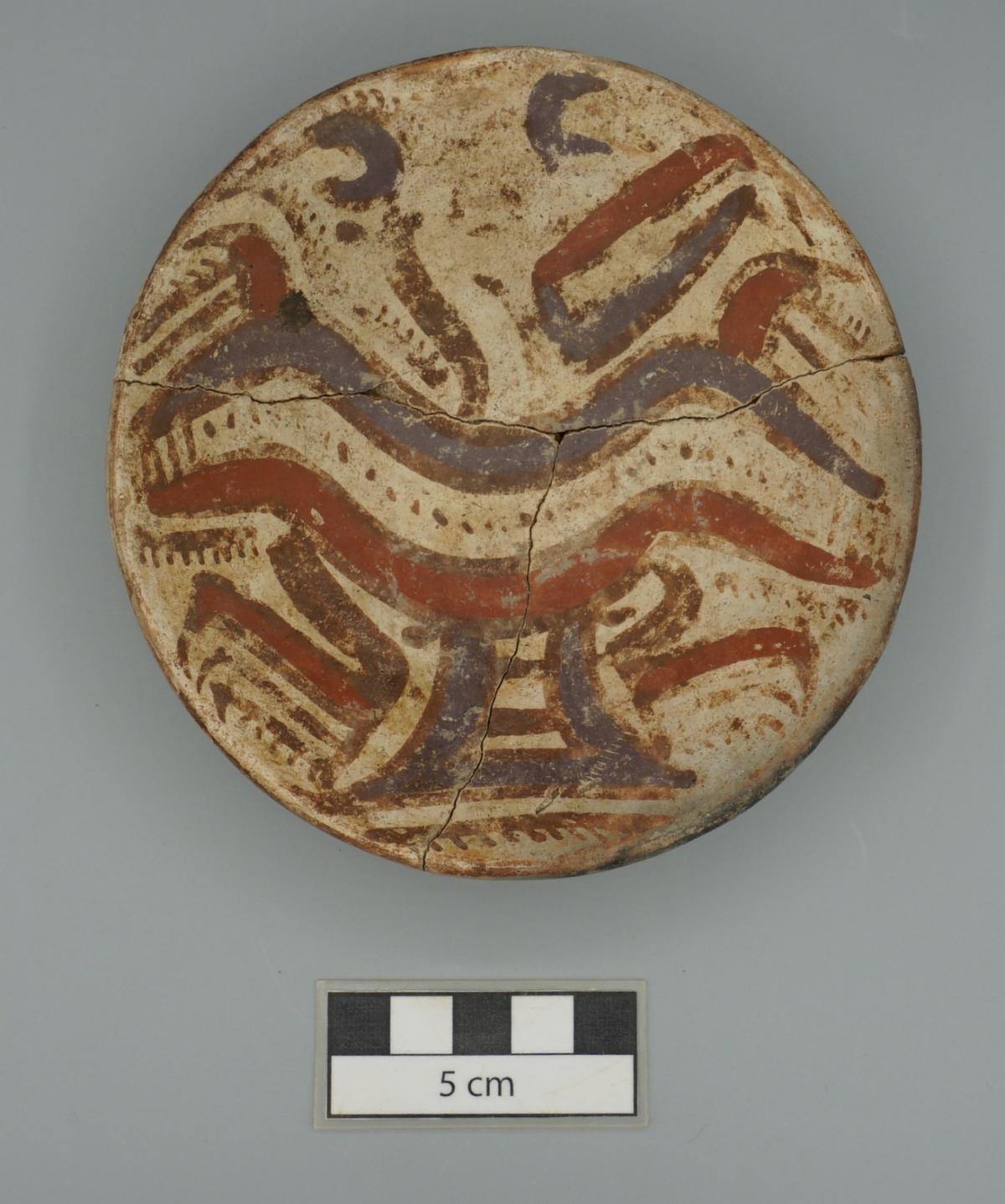 385 - Plato polícromo de borde engrosado exterior. Doble engobe (blanco en el anverso y rojo en el reverso) y decoración en bandas de color alternas zigzagueantes (rojo y morado).