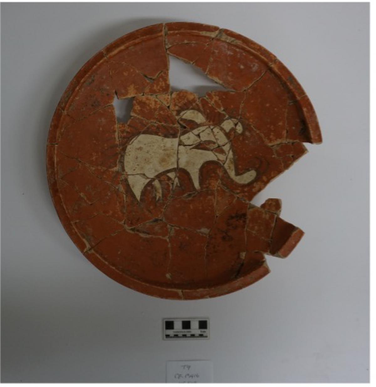 3658 - Cuenco de base plana, paredes ligeramente convexas y borde engrosado hacia el exterior, con engobe rojo externo y blanco interno, decorado con un panel central con la representación de un (...