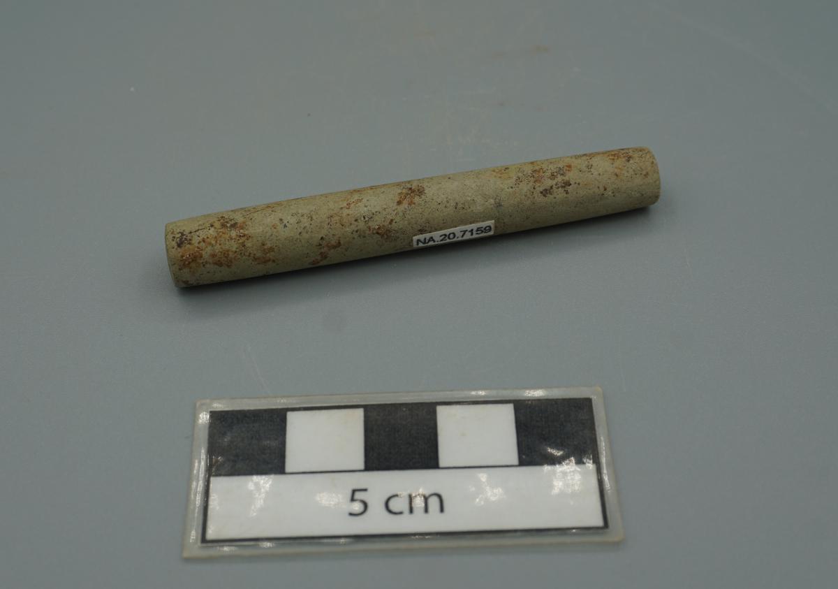 3548 - Tubo de hueso de fauna. El artefacto se encuentra fragmentado y presenta un evidente pulimento en su superficie. Se infiere que originalmente se trató de un hueso largo, con un conducto que...