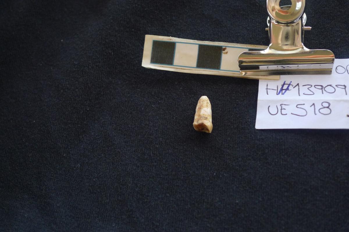 3570 - Diente perforado de tiburón. La perforación indica que pudo haber formado parte de un artefacto ornamental.